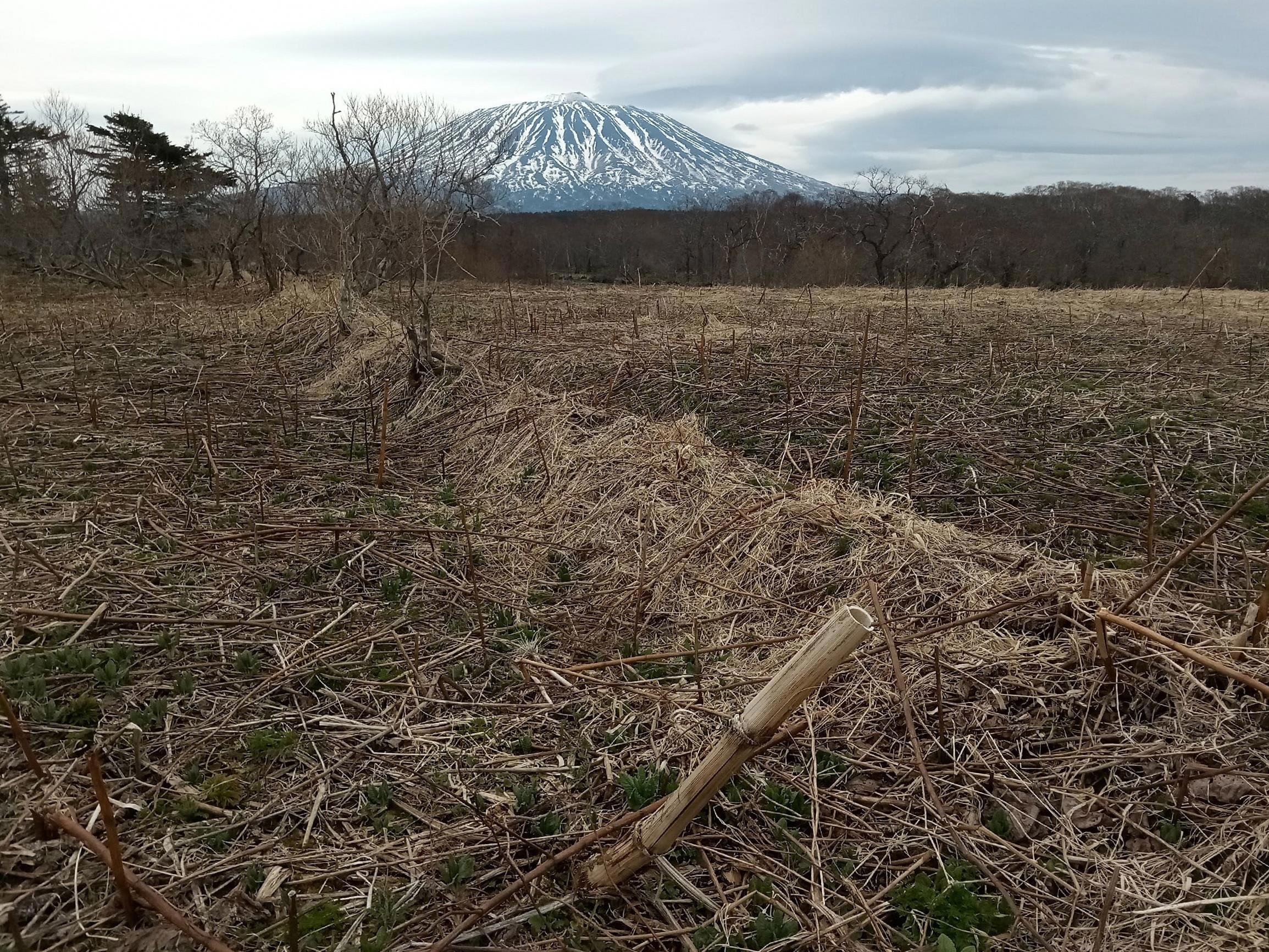 На переднем плане остатки вала, ограждающего давным-давно заброшенное японское село на берегу реки Тятина. На заднем, соответственно сам вулкан Тятя.