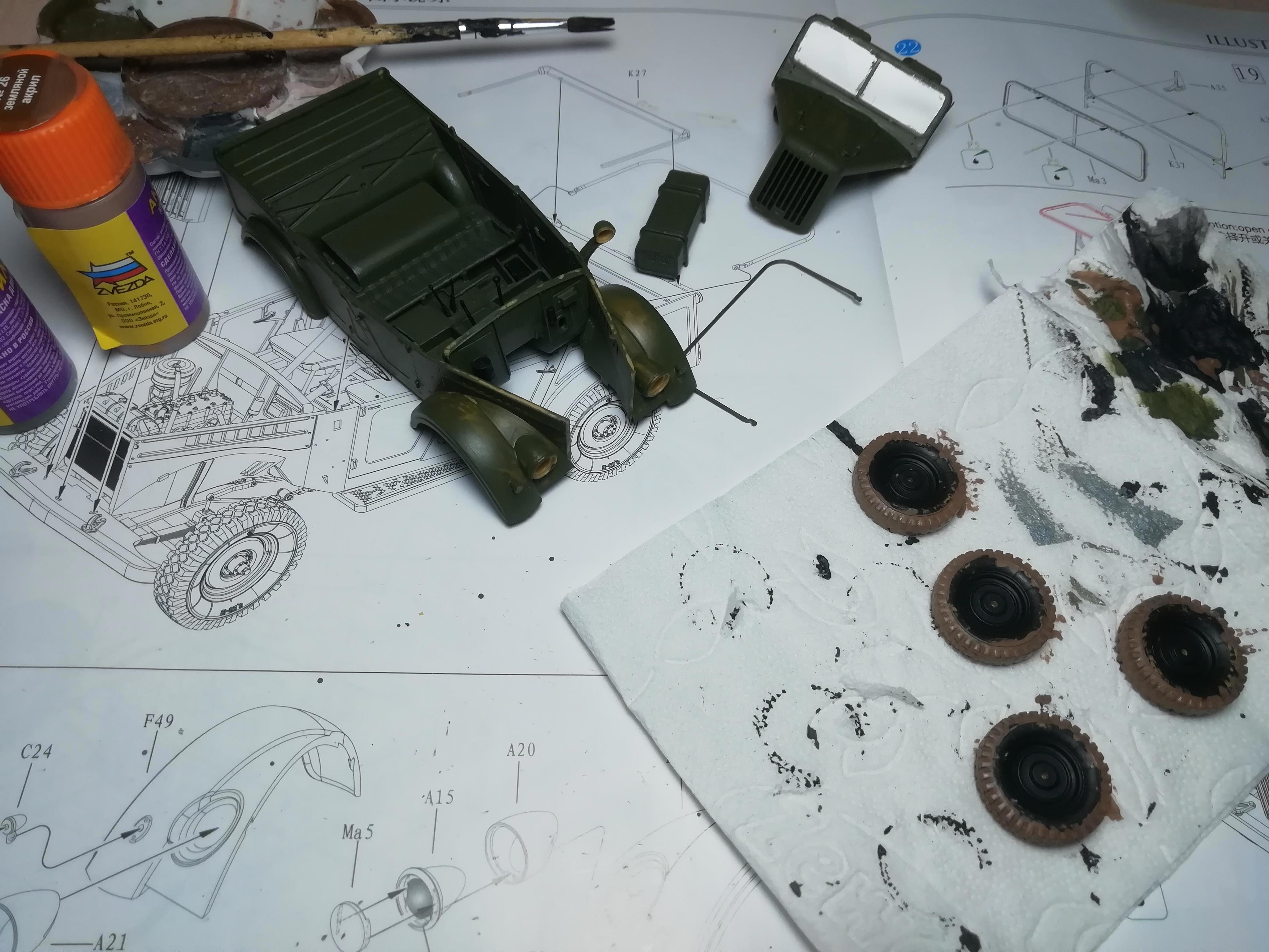 Ну а диорама тоже движется - покрасочный цех, что называется, работает вовсю. Колёса решил сразу красить грязью - зачем мелочиться? ;)