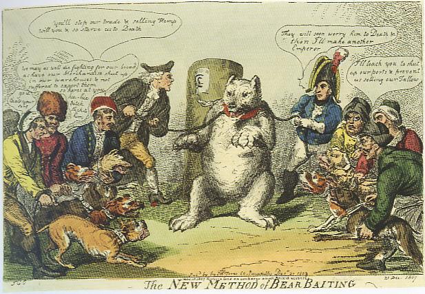 Наполеон и Талейран сдерживают Медведя-Александра, атакуемого британскими торговцами, причём Наполеон говорит: «Они разъярят его до смерти, а затем я поставлю другого Императора…»
