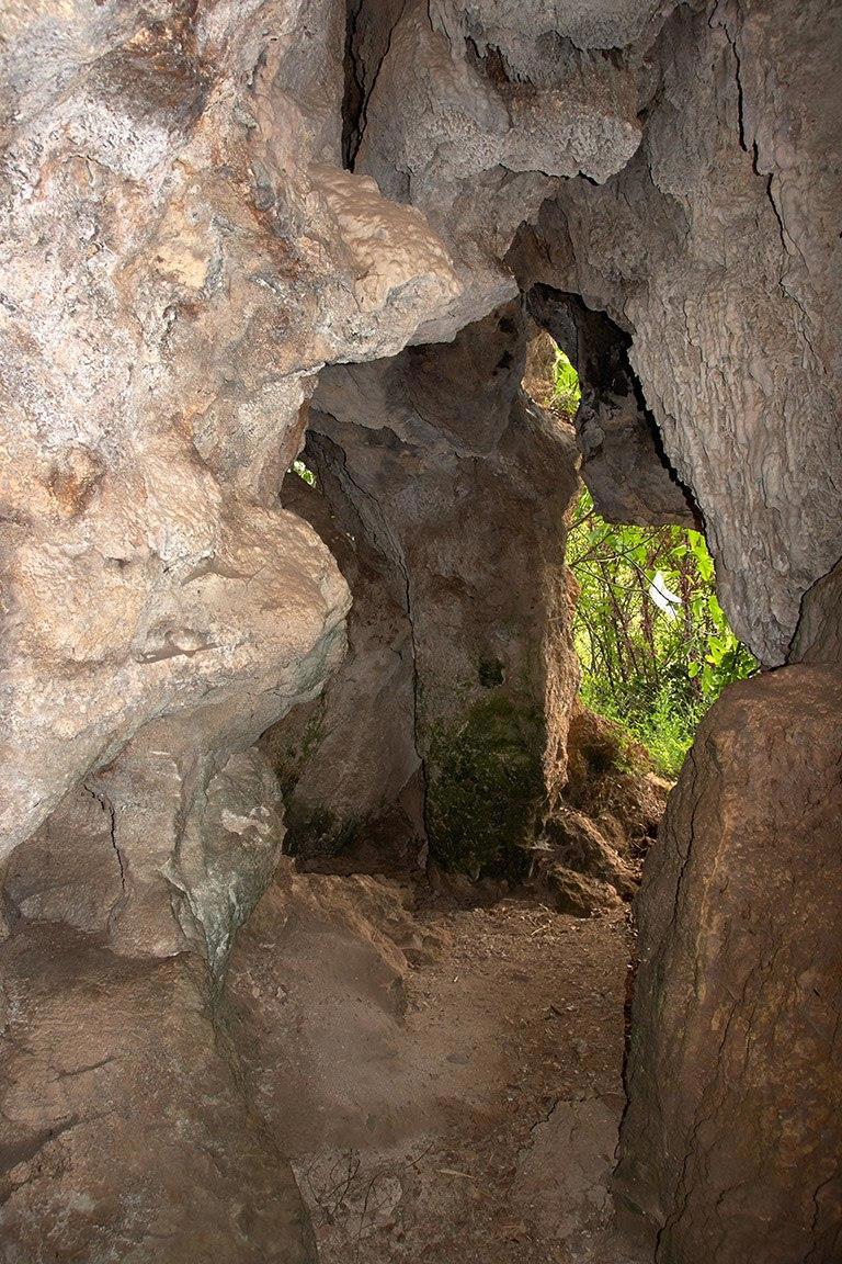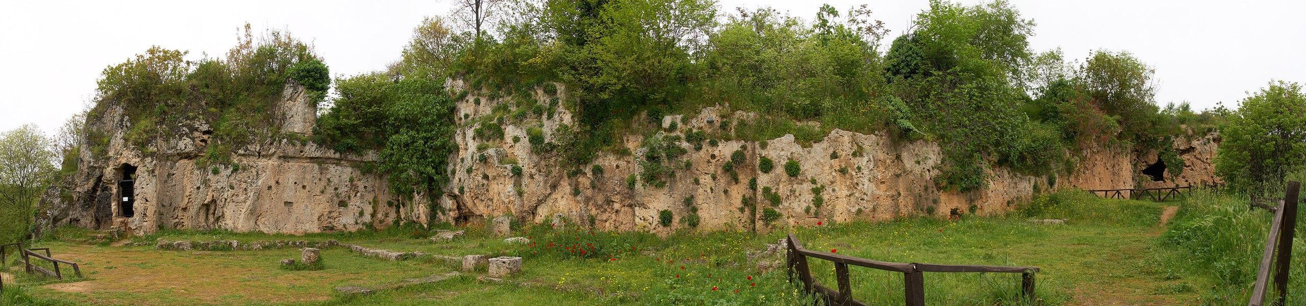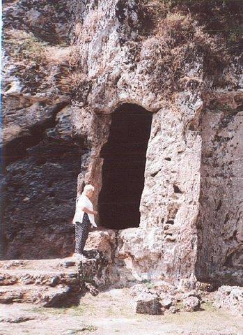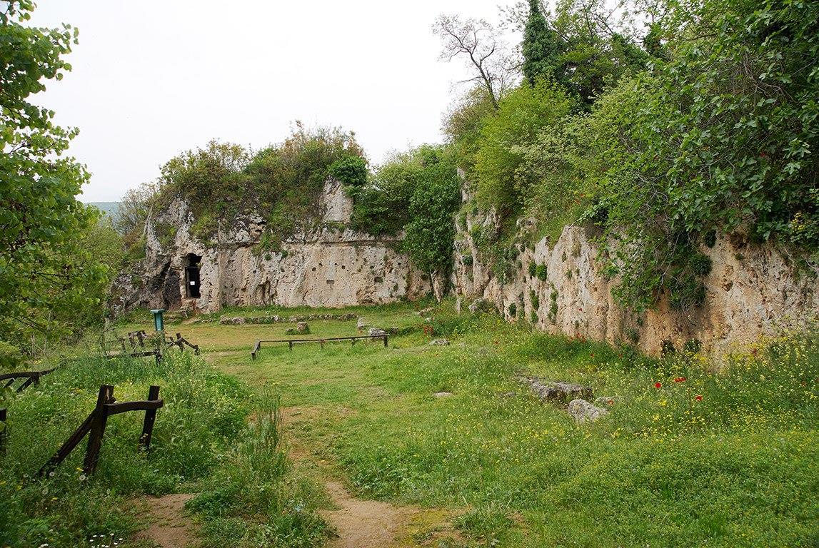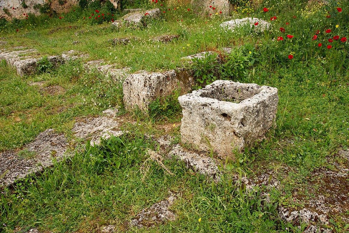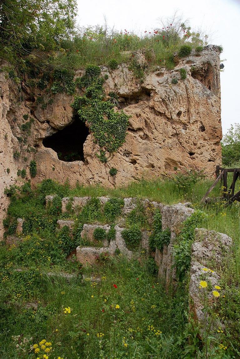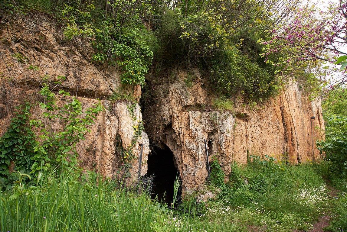 Школа располагалась на площадке возле обтесанной до вертикальных стен скалы. Сохранился фундамент портика, здесь стояла колоннада ионического ордера. В скале имеются отверстия – это входы в пещеры. Всего пещер этих три: вход в первую перекрыт решеткой, зато в две другие можно пройти.