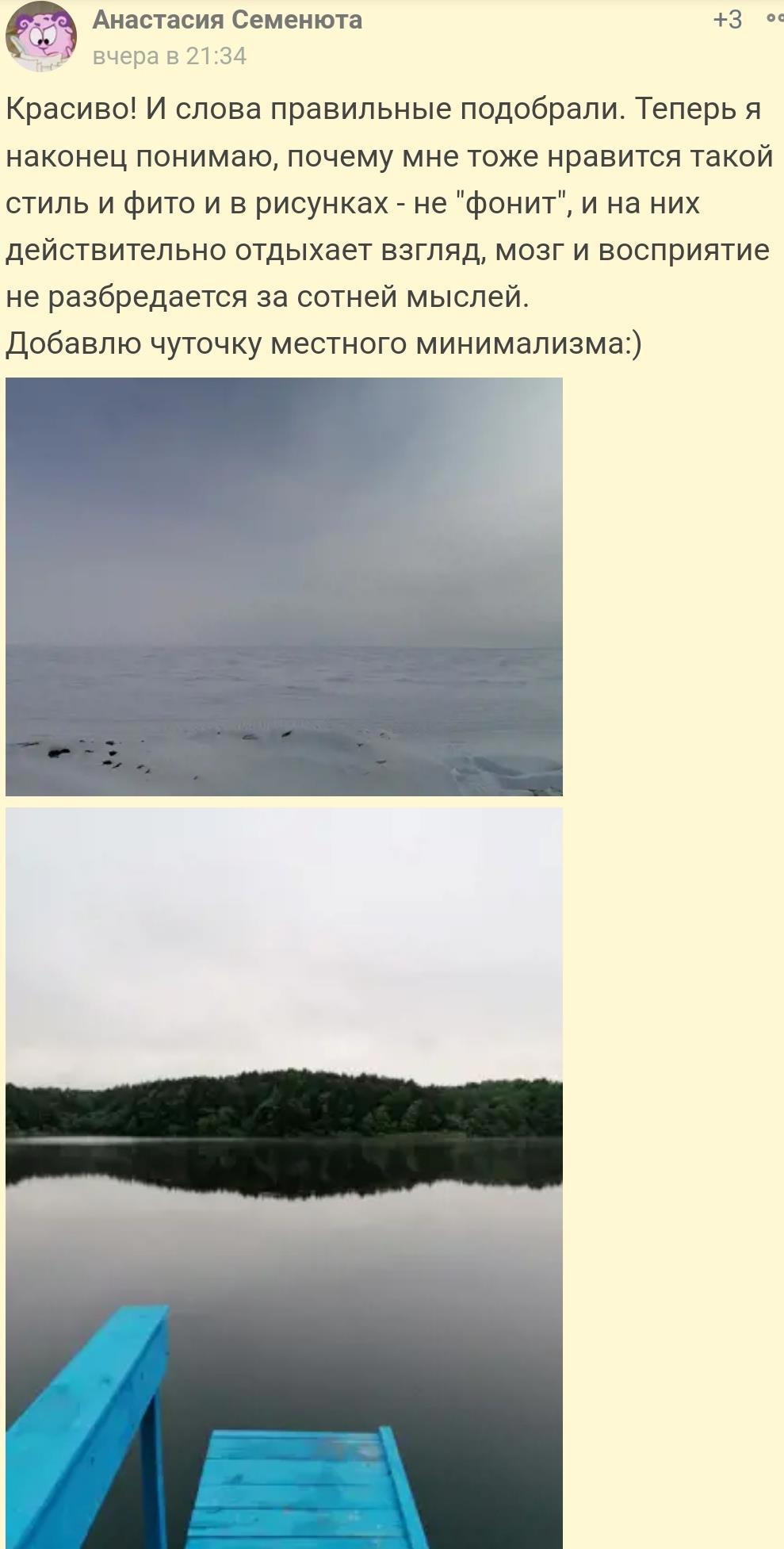 Минимализм это как сигнал от одной планеты к другой, от одного одиночества к другому. Кто-то отправляет в фотографии кусочек своей души в никуда и замерев сердцем ждет ответа. Возможно ли совпадение волн и мыслей в той неразгаданной пустоте? Возможно ли, что в бесконечной Вселенной существует кто-то, кто думает также как ты, и он не только услышит тебя, но и отправит ответный отзыв?