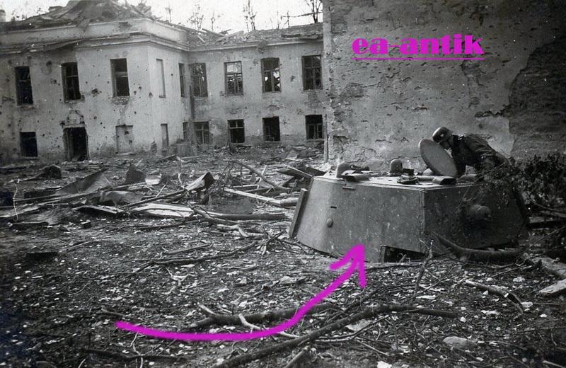 Башня от танка КВ-1, который был потерян в сентябре 1941 года в Красногвардейске. На заднем плане одного из снимков видно здание бывшей женской Мариинской гимназии. Сейчас в этом здании находиться музей города Гатчина.