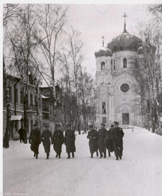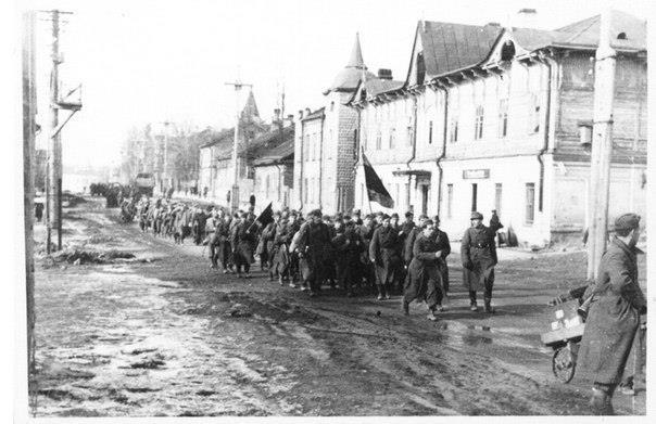 Красногвардейск (Гатчина). Колонна испанских солдат идет по ул. Чкалова.