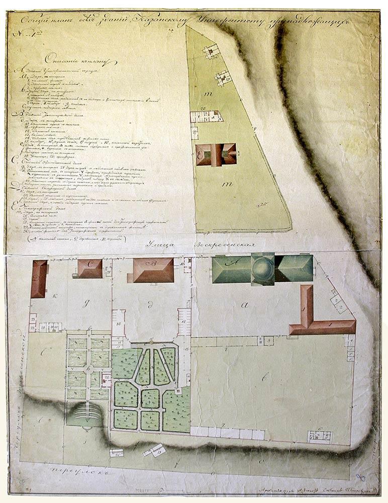 План зданий Казанского университета в 1820-х годах. A — гимназический корпус, B — "тенишевский" дом, C — комендантский дом, D — "спижарный" дом, E — "типографский" дом.