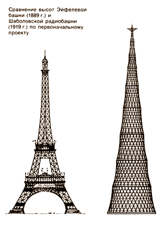 Первоначальный проект Шухова подразумевал возведение 350-метровой башни гиперболоидного типа, которая по высоте превзошла бы Эйфелеву башню, а весить при этом должна была в три раза меньше — 2200 вместо 7300 тонн.