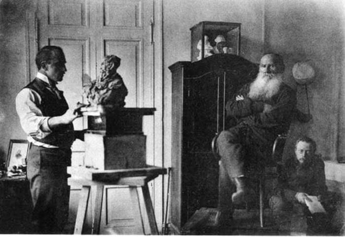 С 15 по 23 апреля 1898 г. он моделирует бюст писателя: « Вечером был у нас князь Трубецкой, скульптор, живущий, родившийся и воспитавшийся в Италии. Удивительный человек: необыкновенно талантливый, но совершенно первобытный. Ничего не читал, даже Войны и мира не знает, нигде не учился, наивный, грубоватый и весь поглощенный своим искусством. Завтра придет лепить Льва Николаевича и будет у нас обедать».