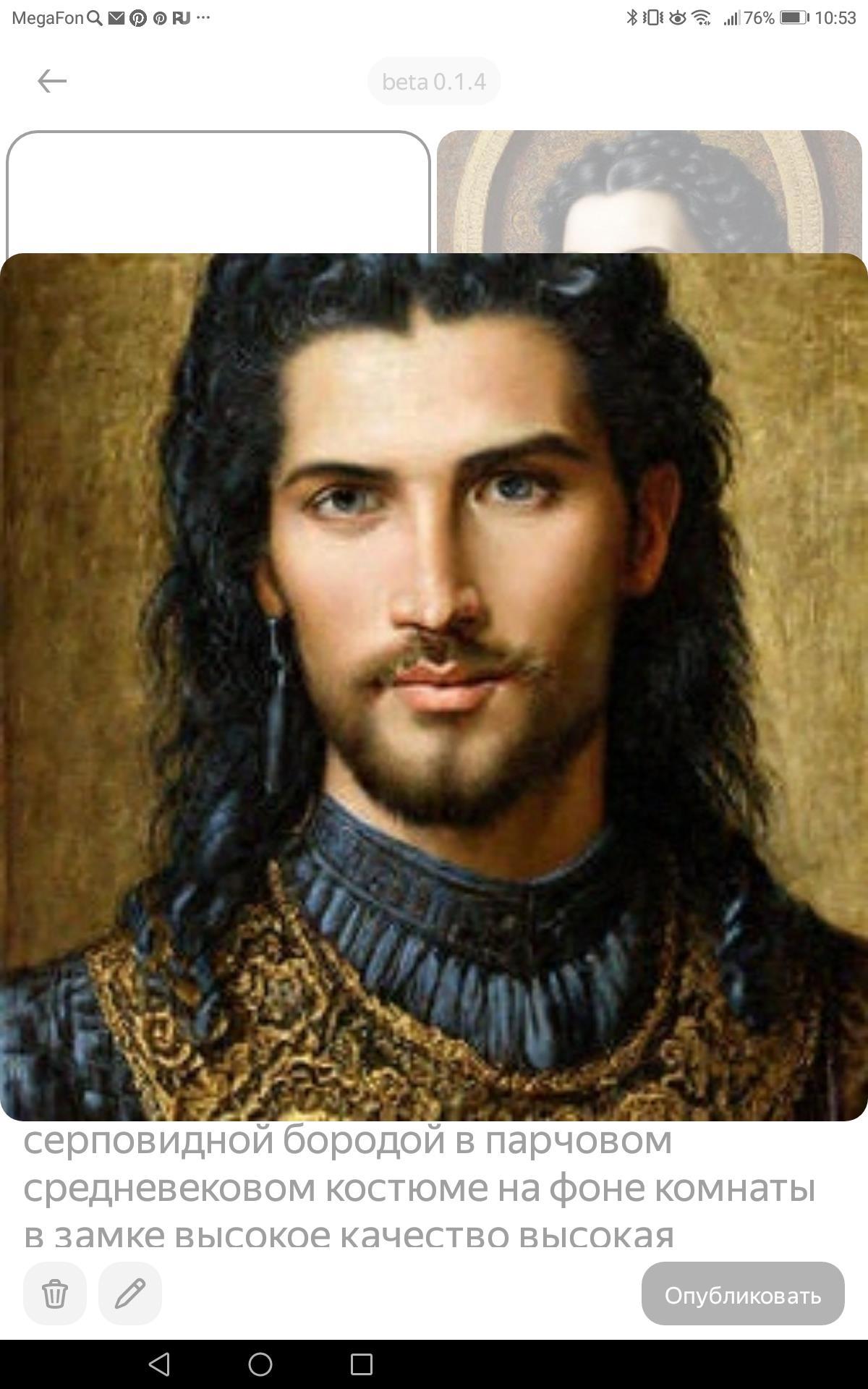 На самом деле ничего сложного в этом нет. Я работала с российскими сервисами, имея довольно скромную цель сделать новую обложку для романа. Для начала мне нужен был портрет главного героя. Кандинский мне в этом деле не помог. Все лица у него получались однообразными с ярко-выраженными надбровными дугами и тяжёлым подбородком. Что называется, не мой типаж. Зато Шедеврум сразу начал выдавать то, что надо. Он представляет сразу четыре варианта портрета, часто абсолютно разных, может «вдохновляться» стилями великих художников. Я закладывала в запросы Рафаэля, Тициана и Леонардо. Понравившихся мне вариантов было много, но я остановилась на этом.
