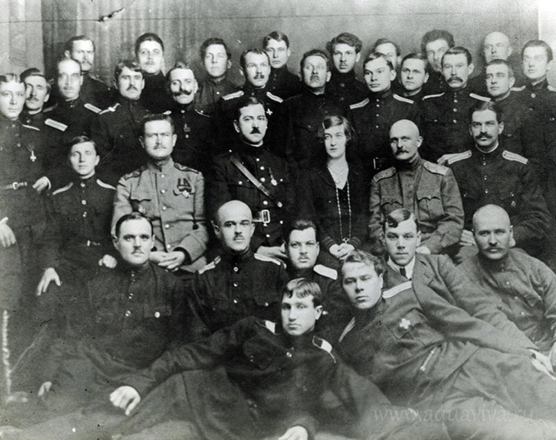 Первый состав хора. Сергей Жаров сидит первый слева, рядом офицеры и генералы Белой армии, в центре французский генерал Бруссо. Остров Лемнос, 1921