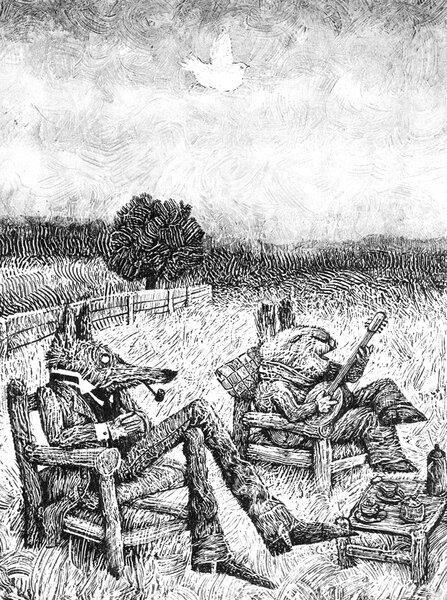 Многие книжные графики, в том числе и очень известные, рисуют много, но, увы, очень одинаково. Калиновский никогда не был похожим на других и на самого себя. Он всегда был разным. Когда после «Алисы» ему предложили «Сказки дядюшки Римуса», он «перетрусил и всполошился - как их делать? Со зверьем у меня нелады». Но потом решение было найдено: «Сказки дядюшки Римуса» - плотные, фактурные. Мне хотелось сделать как бы масляную живопись. Щетинной кистью покрывал краской все поле листа. А потом в нужных местах эту фактуру процарапывал бритвой, рисунок заливал черной акварелью. Получались рисунки острые, «колючие», без намека на идиллию».