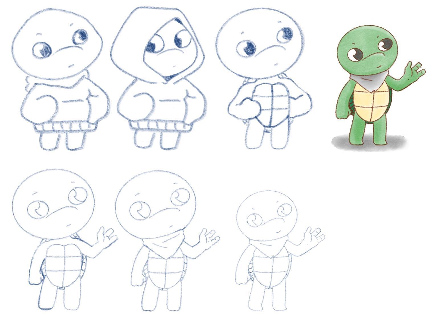 А ещё я рисовал черепашек, но они шли гораздо медленнее и сложнее, ну и в итоге не очень чтобы получились (так, как мне хотелось). Одеваешь черепашку в кофту - панцирь теряется, а с видимым панцирем только ремешки, бандану и шляпу для одежды использовать... Может быть, у меня просто завышенные требования, не знаю... Тем не менее, набросочки: