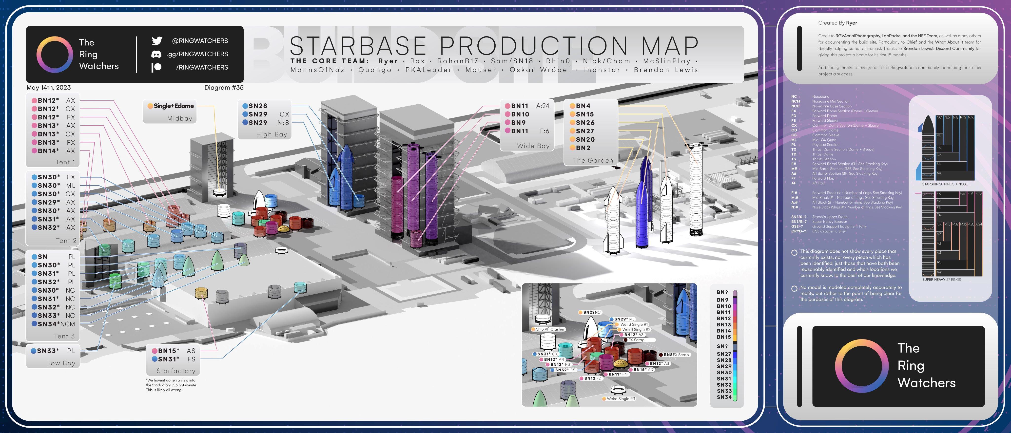 Собственно на рисунке (кликабельном) наглядно (источник). Два ускорителя уже собраны (разве что один пока без двигателей), третий достраивают, четвертый начинают собирать. Аналогично с кораблями: два (SN26 и SN27) стоят на "аллее славы", но теоретически могут быть привлечены для полетов, SN28 завершает сборку, SN29 - ведется крупноузловая сборка. Плюс на схему не попал уехавший на испытания Starship SN25.