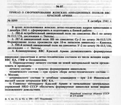 Так же, по приказу Народного Комиссара Обороны Союза ССР И.В.Сталина за № 0099 от 08.10.1941 «О сформировании женских авиационных полков ВВС Красной Армии», " ... Переподготовку личного состава на новой материальной части организовать и проводить: ... технического состава — при пункте сбора летно-технического состава — г. Москва«.