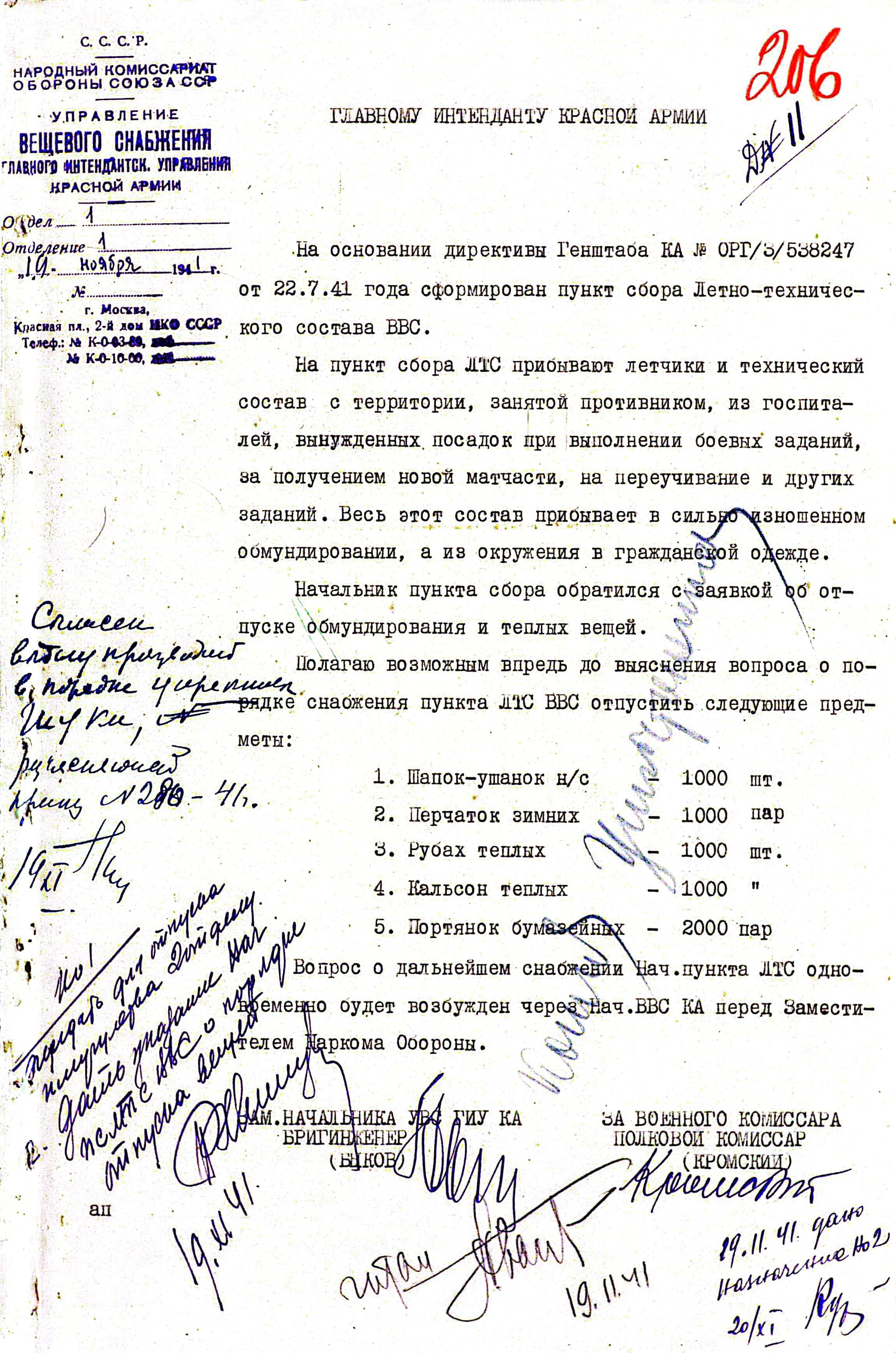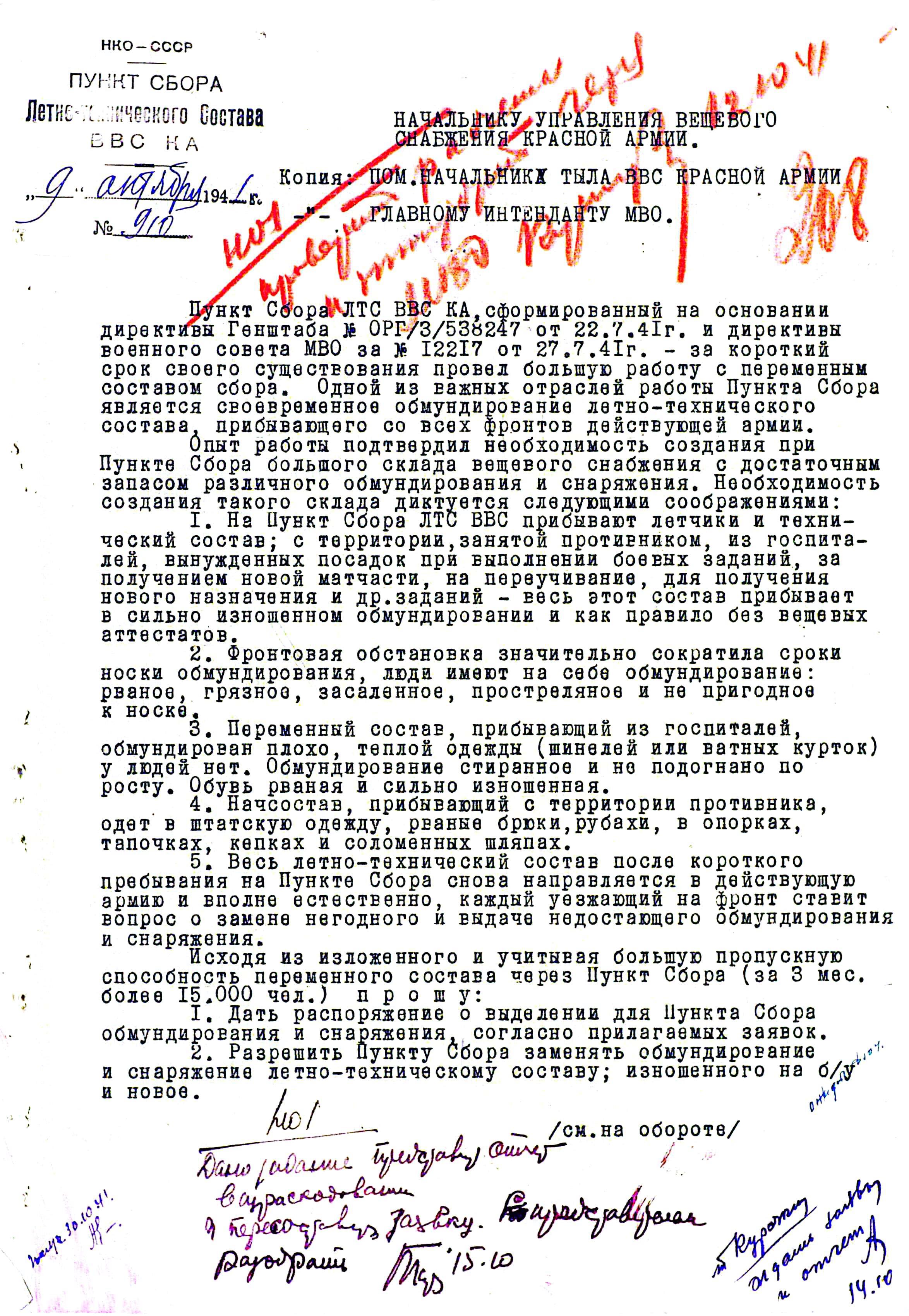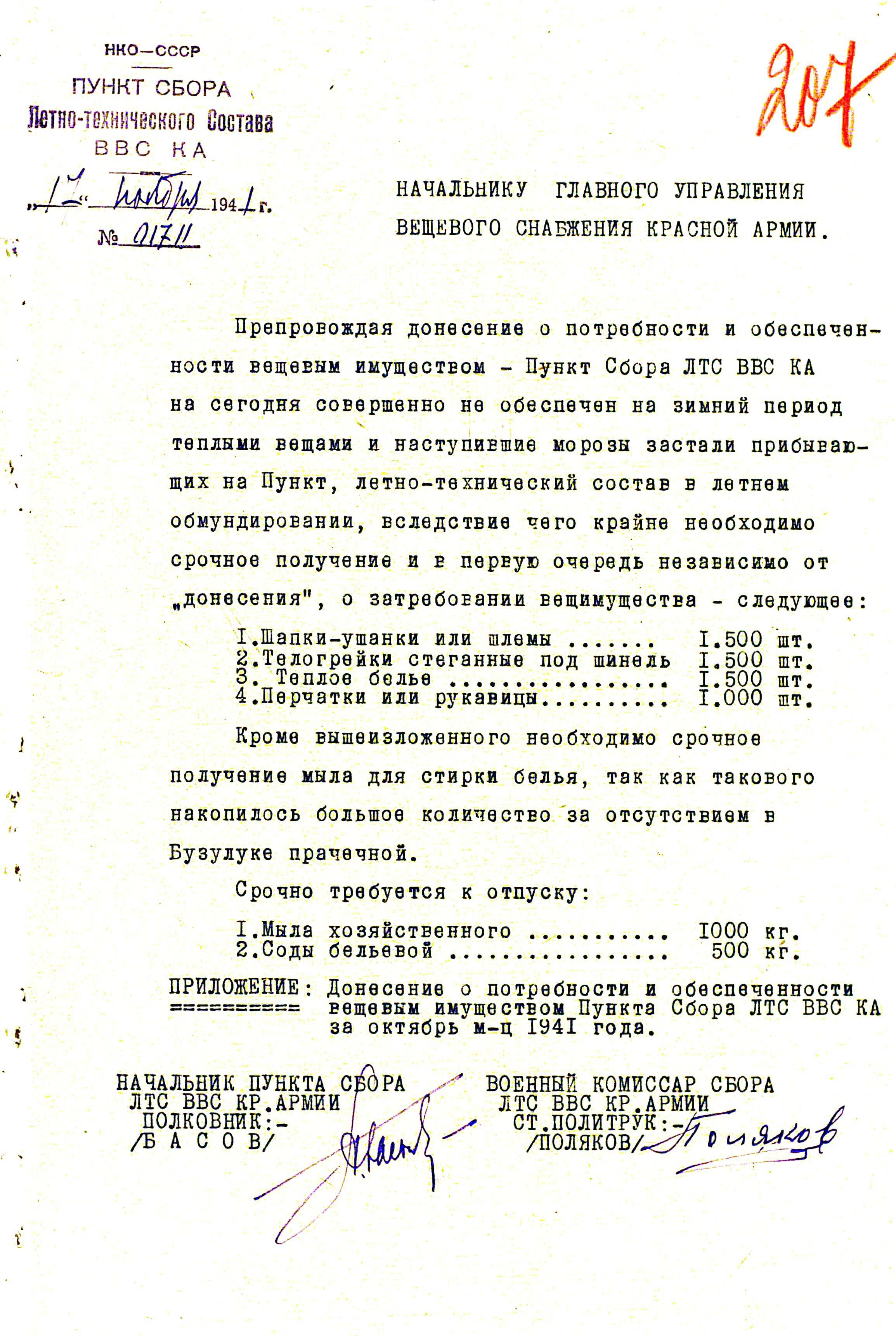 Следующее обращение по обеспечению прибывающего переменного состава, командование Пункта Сбора ЛТС направило через месяц, а точнее — 17 ноября 1941 г. И в этом письме меня привлекли два любопытных момента: во-первых, регистрационный номер и дата обоих писем проставлены одной рукой, а во-вторых, в повторном обращении есть такое предложение: «Кроме вышеизложенного необходимо срочное получение мыла для стирки белья, так как такового накопилось большое количество за отсутствием в Бузулуке прачечной.». То есть, Пункт Сбора летно-технического состава ВВС Красной Армии, как и другие учреждения, эвакуировался из Москвы в Бузулук (Оренбургской обл.). Тогда и разделение на Центральный (в Москве) и Резервный (в Бузулуке) ПС ЛТС произошло скорее всего в начале 1942 года, после частичного возвращения командования и инструкторов Пункта из эвакуации.