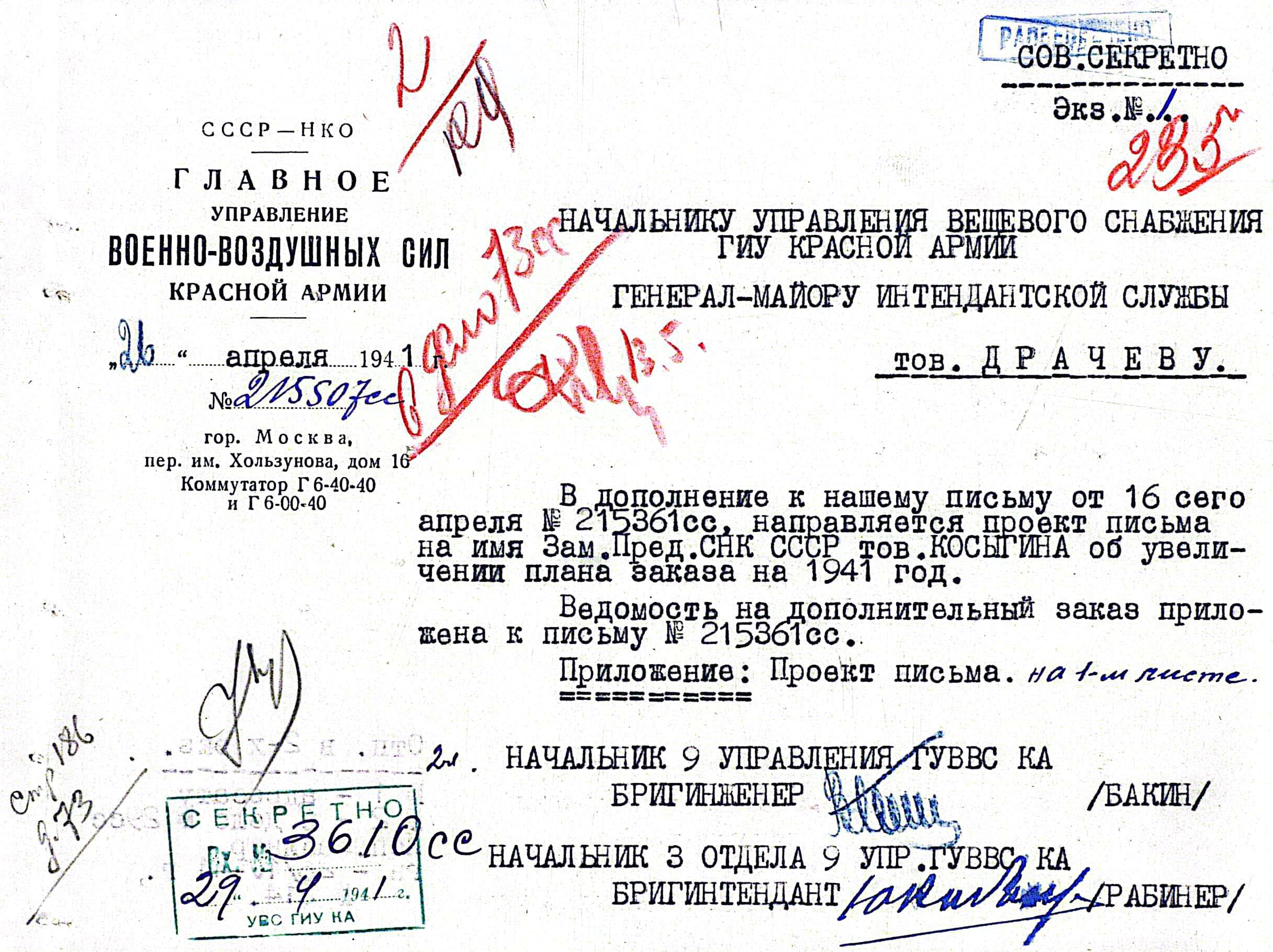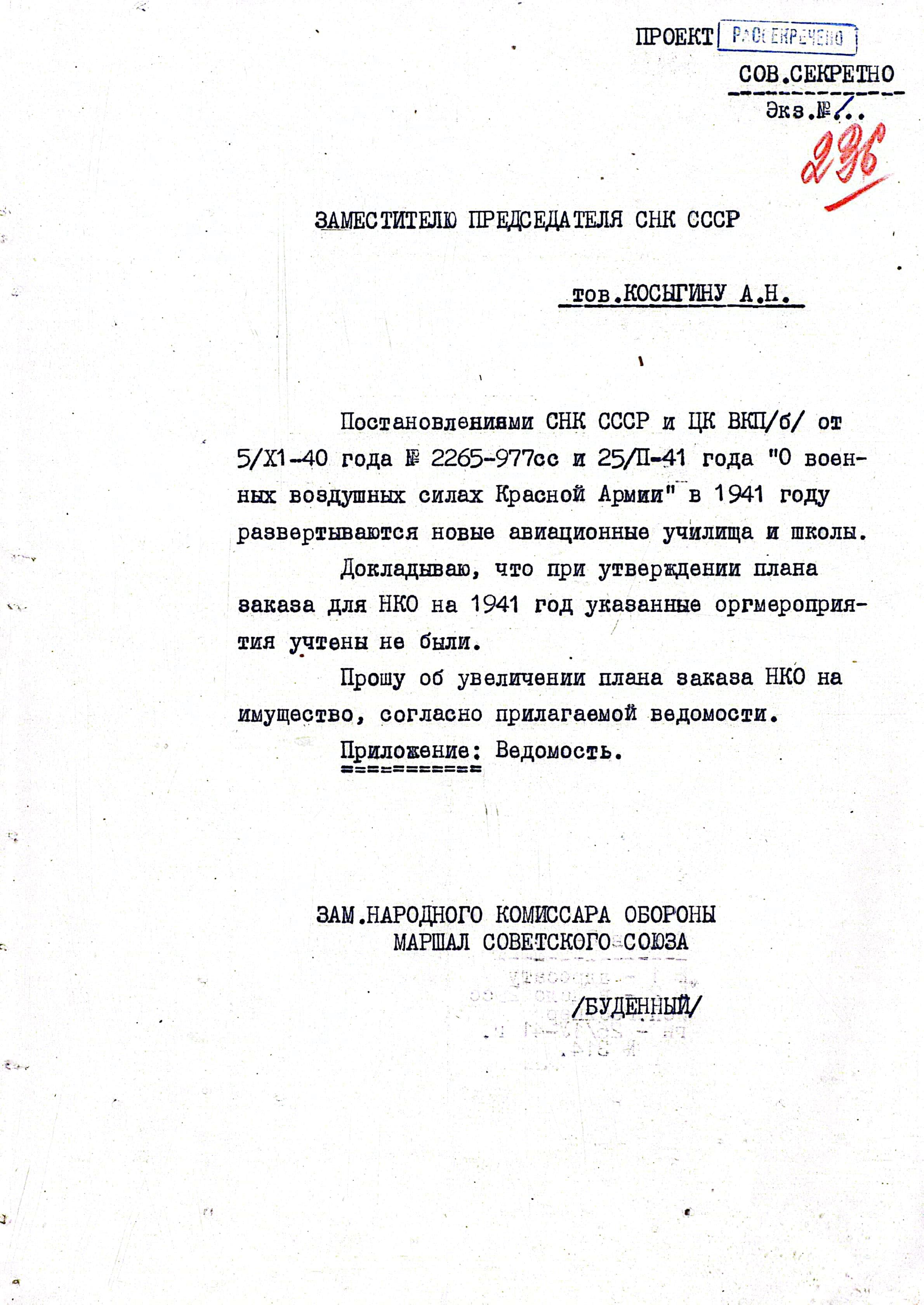 Похоже, что дело продвигалось недостаточно быстро, имущество хоть и поступало в больших объемах, но всё же его недоставало. А собственных ресурсов, для обеспечения вновь создаваемых авиационных школ и училищ, у Главного Управления ВВС КА было маловато. Чем-то иным сложно объяснить появление в конце апреля 1941 г. очередного письма от ГУ ВВС КА, к которому прилагался проект обращения Заместителя Наркома обороны маршала Советского Союза С. М. Буденного на имя Заместителя Председателя Совнаркома СССР А.Н. Косыгина. На документе нет каких-либо резолюций и информации о дальнейшей судьбе документа, за исключением одной записи – «В дело». Скорее всего, в Совнарком письмо так и не поступило.