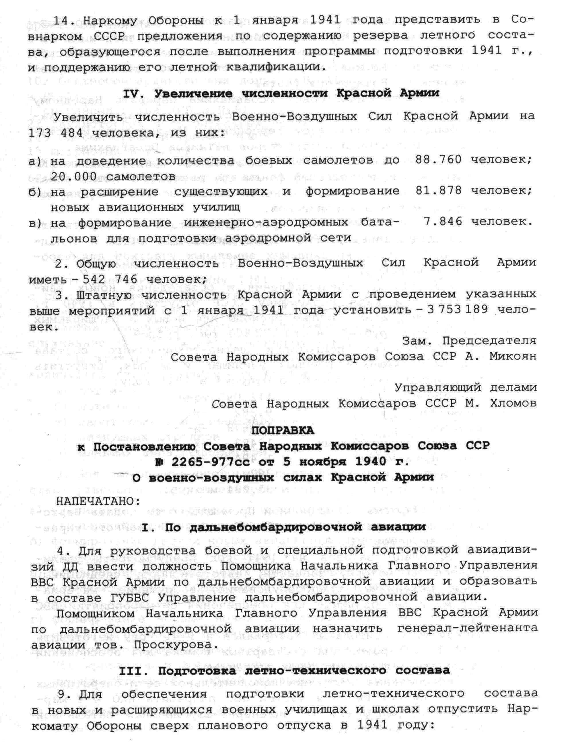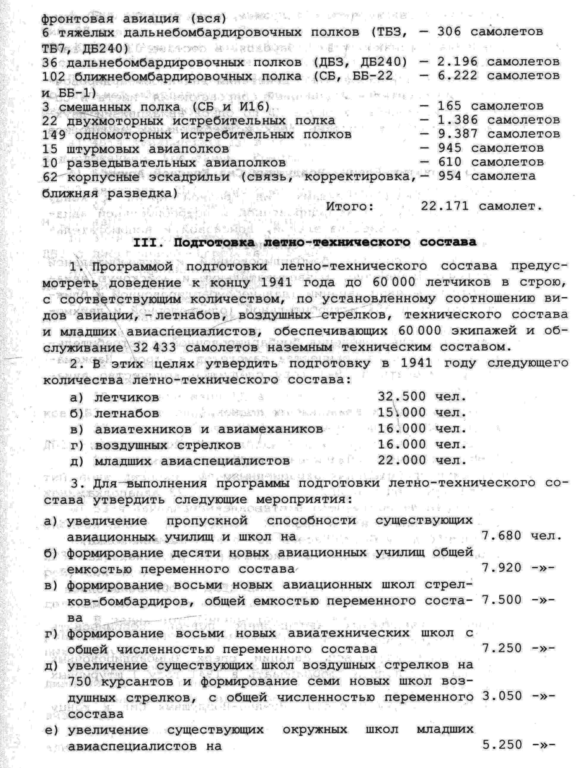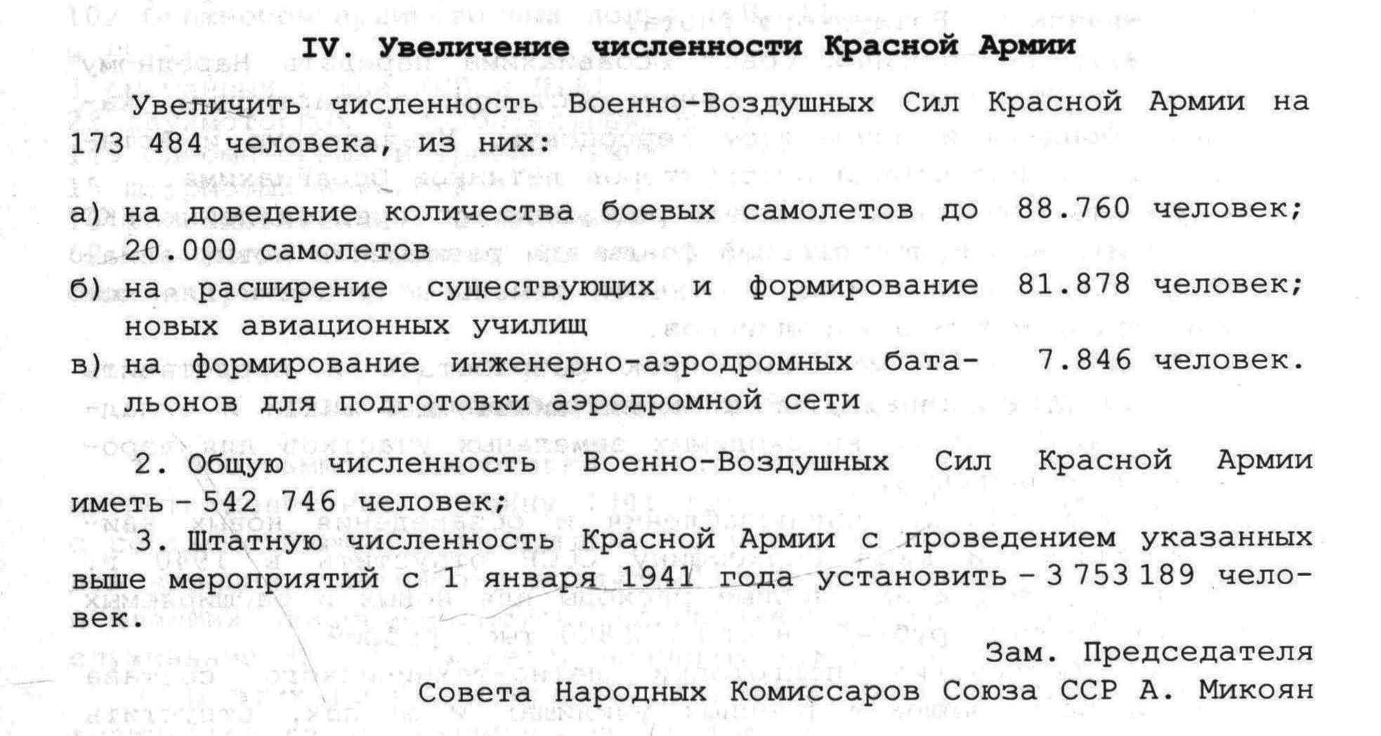 Итак, в соответствии с главой IV. «Увеличение численности Красной Армии», к январю 1941 года, численность ВВС КА увеличивалась почти на треть, а точнее на 173 484 человека и должна была составить 542 746 человек. При этом, к 1 января 1941 г., штатная численность всей Красной Армии должна была составлять 3 млн. 753 тыс. человек.