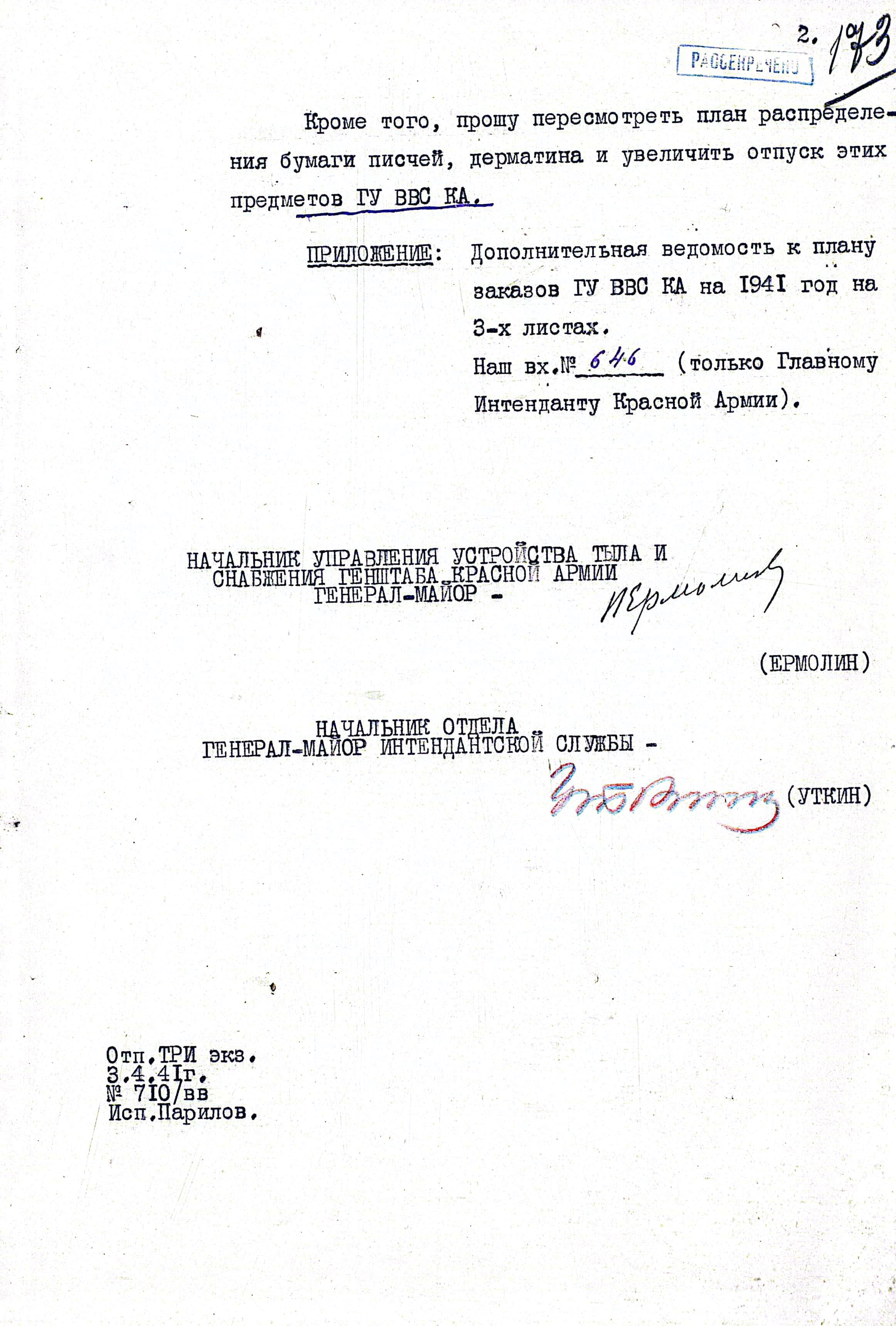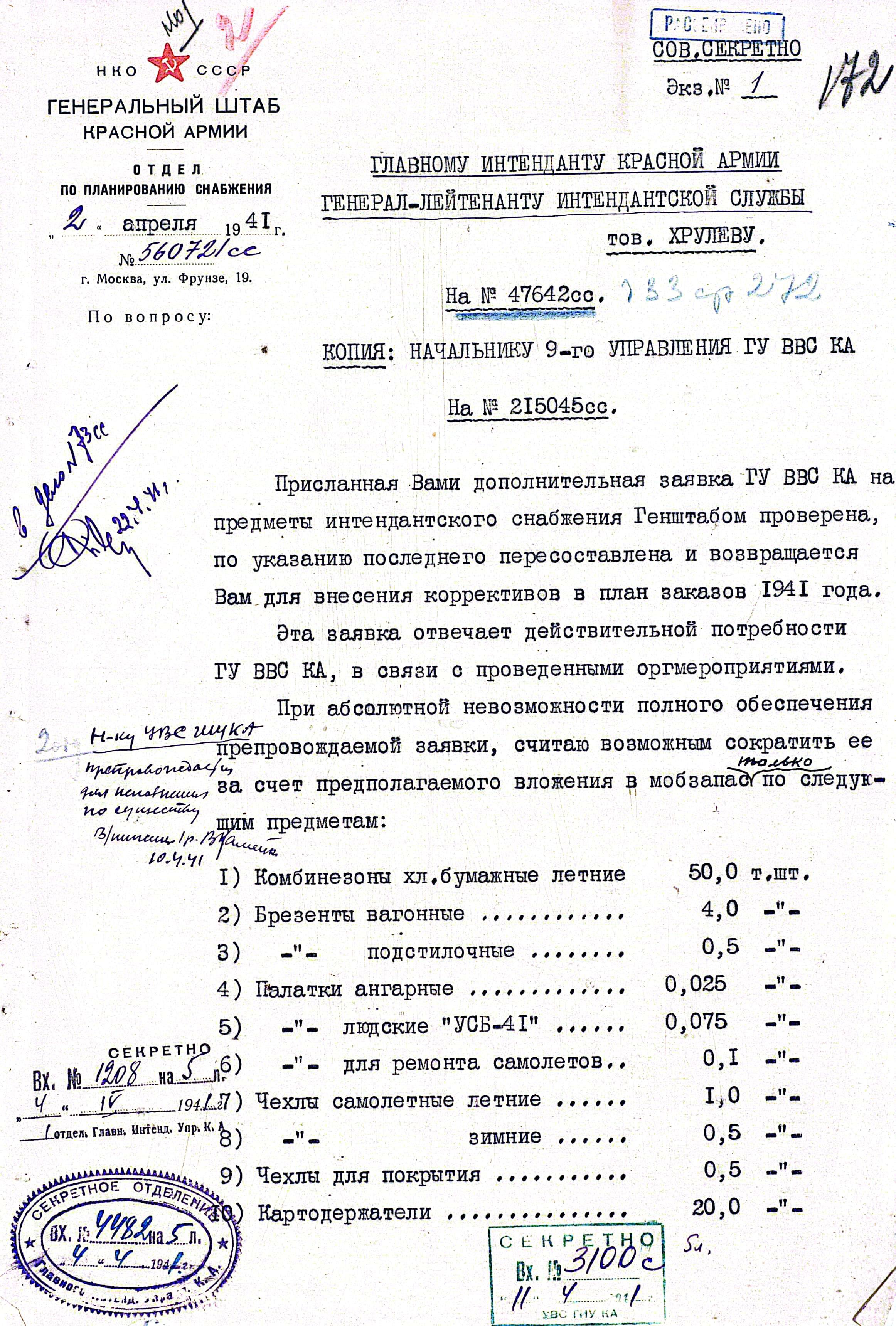 Для рассмотрения, согласования и утверждения, сведения поступили к Главному Интенданту Красной Армии (плюс в копии начальнику Управления вещевого снабжения). Одна из резолюций гласит: «НО-3. Считаю, что следует вопрос повторить через отдел фондов Генштаба». Скорее всего, это связано с тем, что расходы на закупку для обеспечения ГИУ брало на себя, а вот распоряжение на закладку имущества в запасы должен был отдать Генштаб.