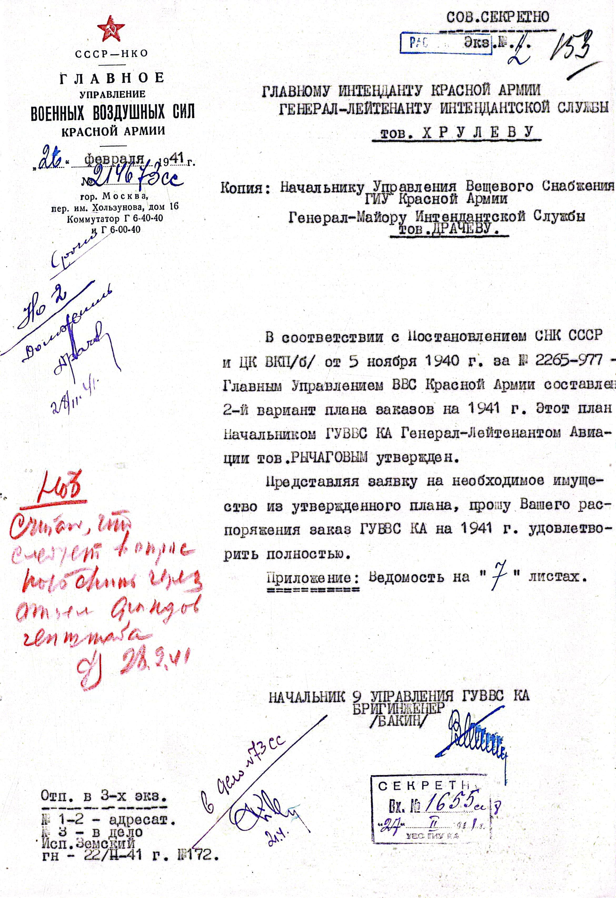 Предвоенный заказ для ВВС, утверждённый генералом Рычаговым