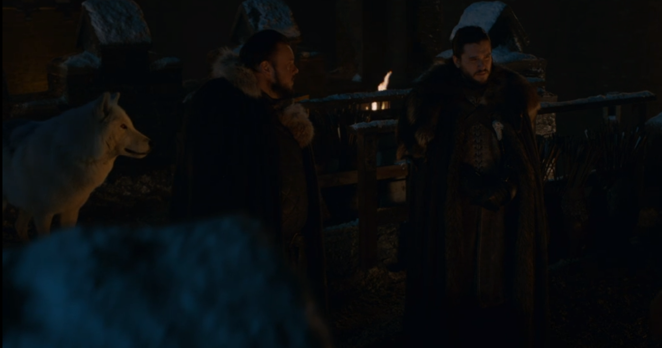 Призрак появляется, Джон рассказывает Дени, что он Таргариен. Описание всего эпизода ожидается.