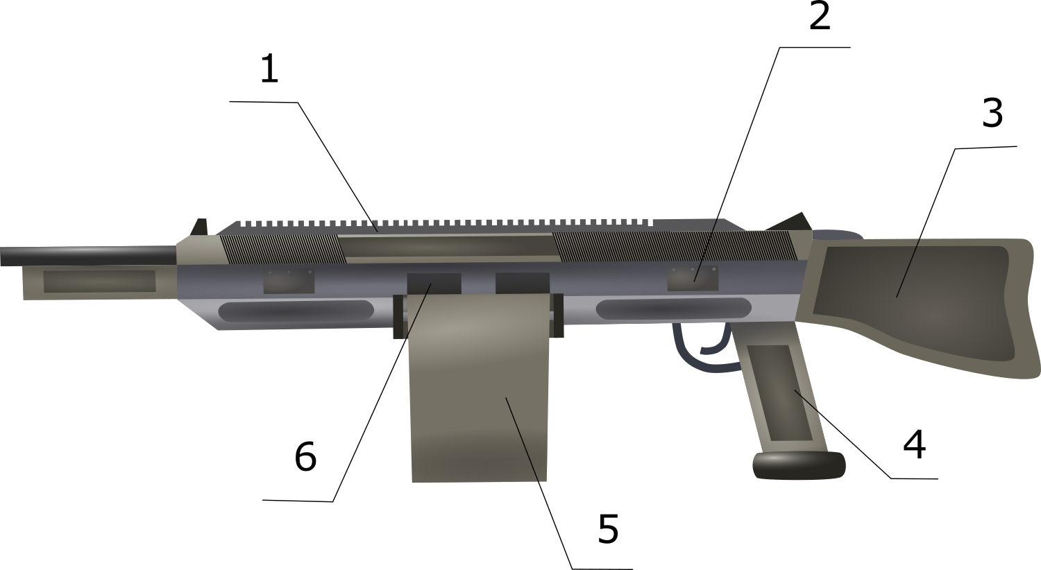 В тыльной части винтовки расположены одновременно самые сложные и самые важные ее части, без которых это оружие превратиться в практически бесполезный кусок металла. Начнем с рукоятки(4). Там располагаются аккумуляторы, которые питают все дополнительные системы оружия и могут перебрасывать свои мощности еще и на основные системы винтовки (разгон, магнитные захваты и т.д.). Рядом с рукояткой располагается разъем для заряда этого самого аккумулятора (2). Несмотря на то, что большая часть человечества уже перешла на бесконтактные методы зарядки, военные не считают эту технологию достаточно надежной и потому применяют ее лишь, как дублирующий вариант.