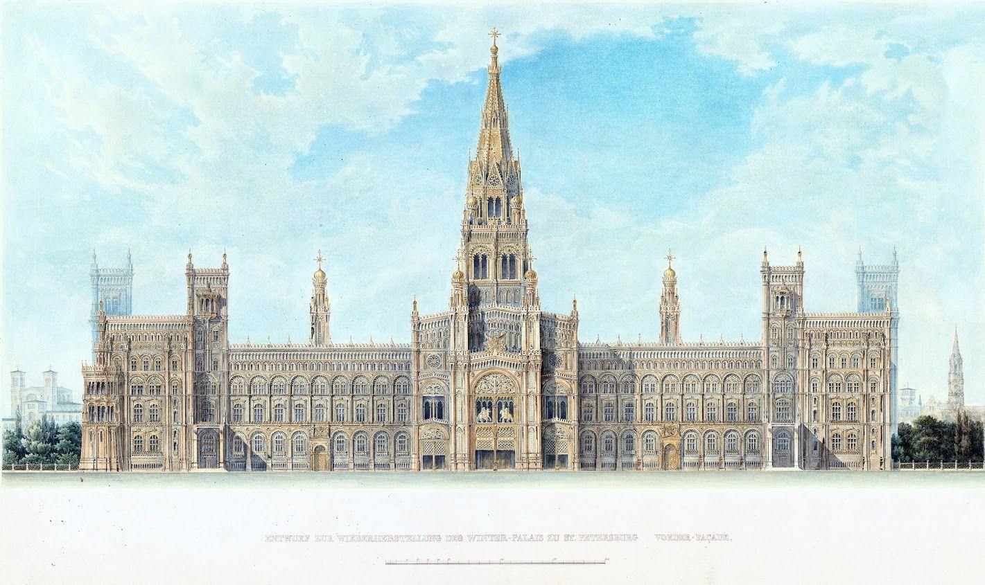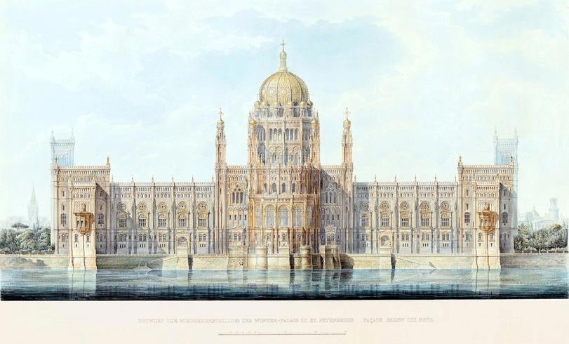 Автор: falesЗимний дворец был разрушен пожаром в 1837 году. Архитектор Вильгельм Штир предложил отстроить дворец по совершенно новому проекту (в стиле "национальной русской архитектуры" - как ее представлял себе Штир).