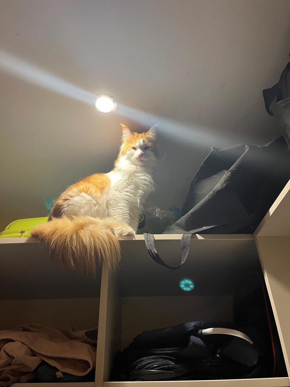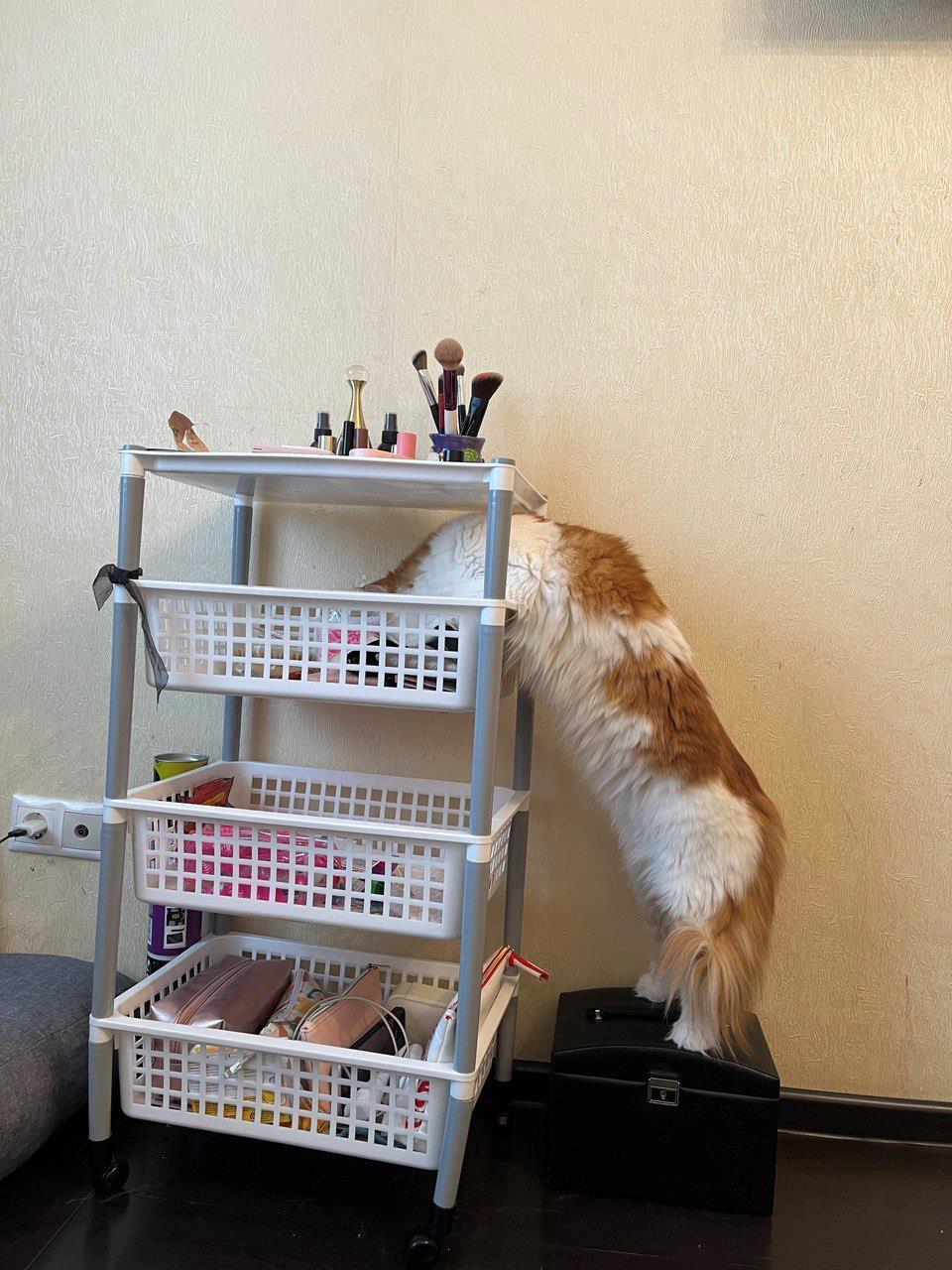 Если я забываю закрыть гардеробную, Кнопочка улучшает момент и проникает внутрь. С полки на полку она перепрыгивает к самому верху.