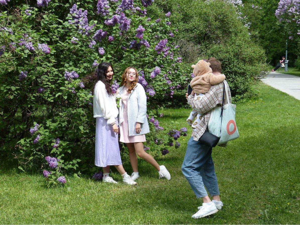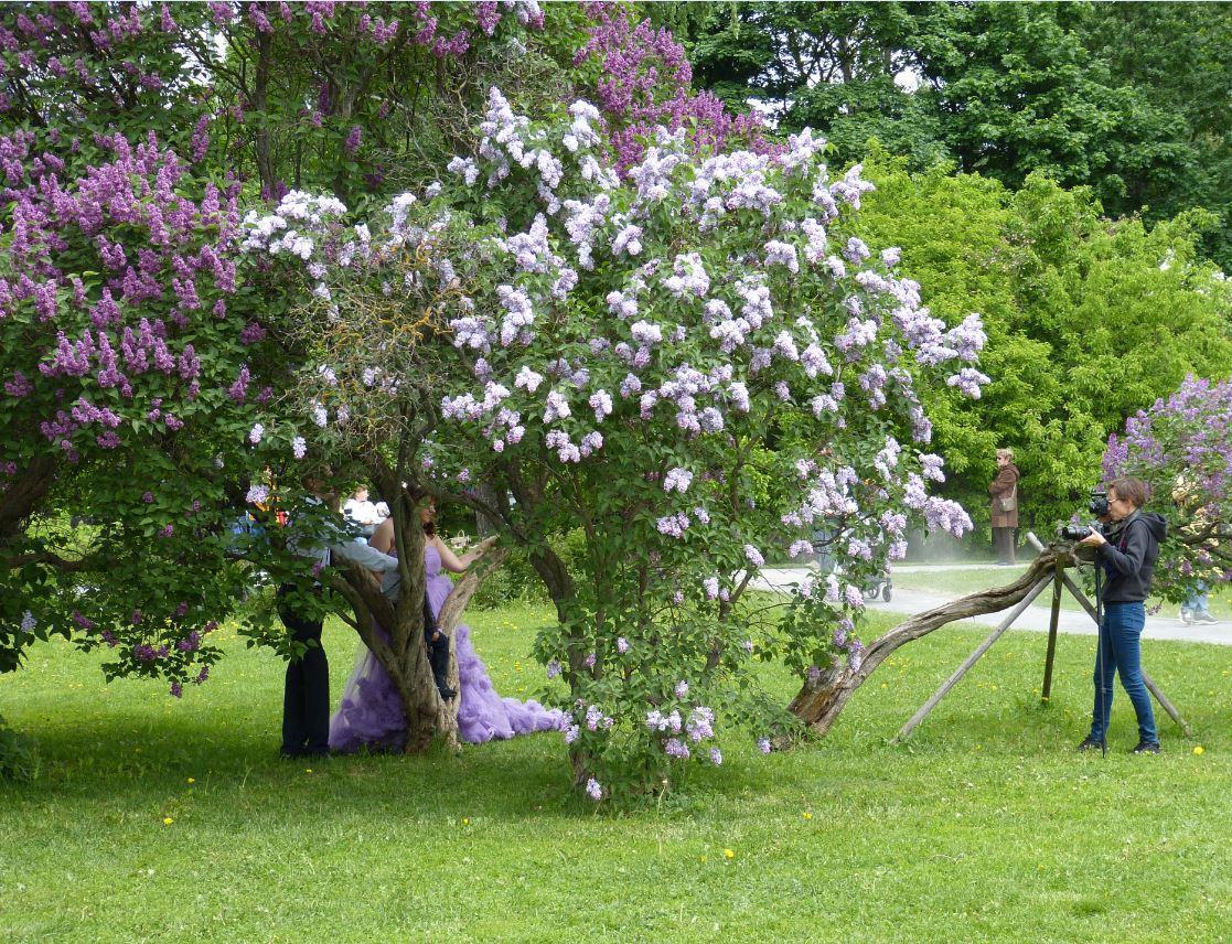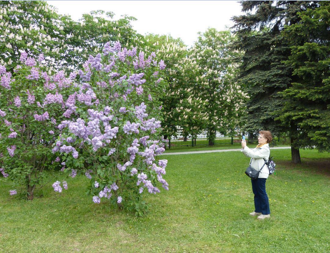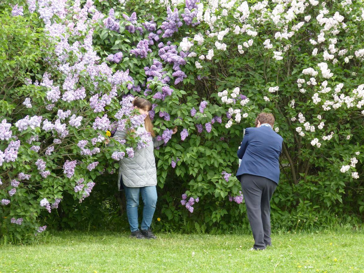 В пору цветения сирени народу в этом саду очень много, особенно в выходные. Кто-то приходит полюбоваться и понюхать, кто-то — пофотографировать.