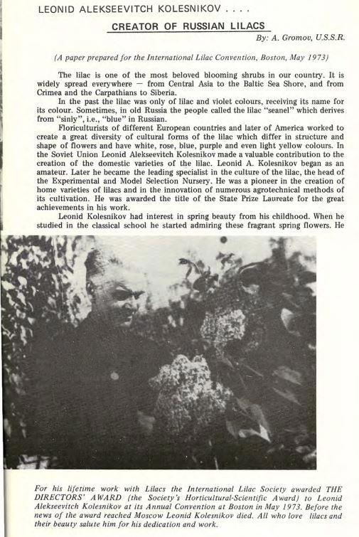 А о питомнике в Москве вспомнили только в 1974 году, после того, как International Lilac Society отметила на майской конференции организации в 1973 году вклад Колесникова во всемирную культуру сирени, а в майском номере журнала этой организации зв 1974 год появилась статья о Леониде Алексеевиче.