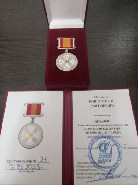 На 12 съезде партии "Справедливая Россия - За Правду", который только что завершил свою работу, Константин получил из рук лидера партии Сергея Миронова медаль "За воинскую доблесть".