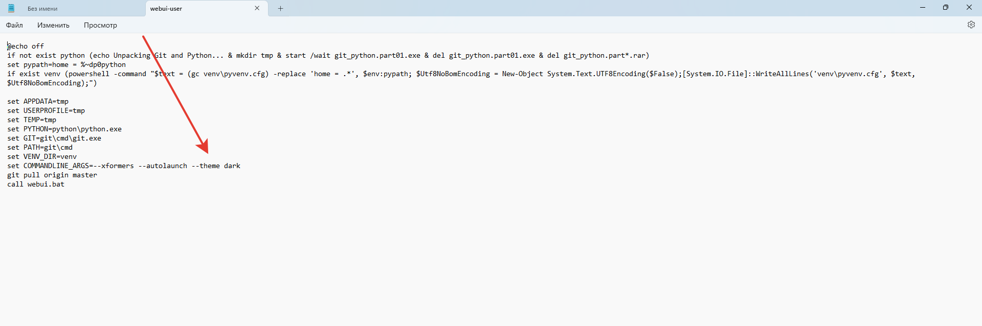 Так же если у вас Видеокарта на 4-6gb то можете вписать --medvram. Это повысит время генерации на 5-7%. Но видеокарта будет чувствовать себя получше.