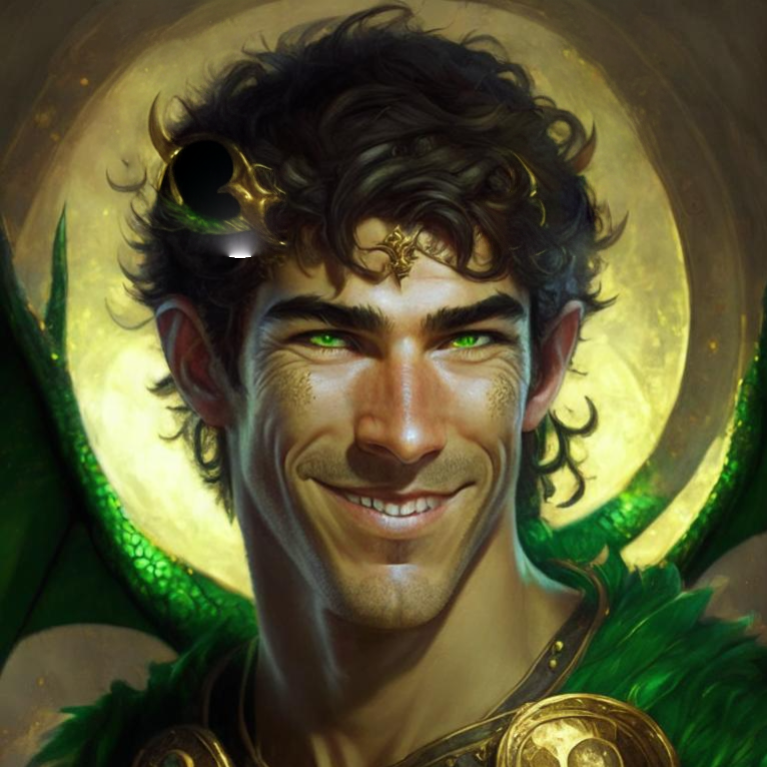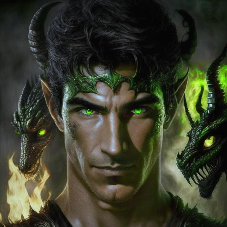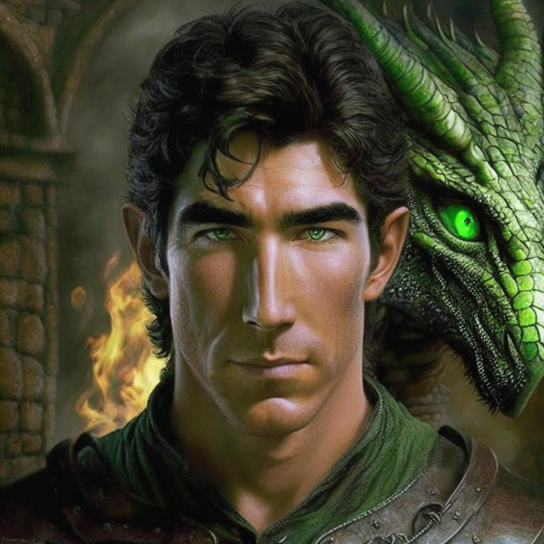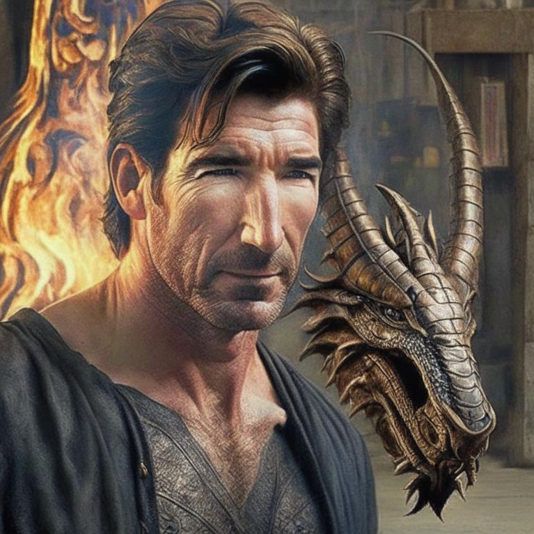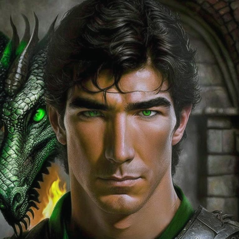 И что-то захотелось мне его навскидку нарисовать! Зарулила в Кандинского (fusionbrain.ai) и задала промт "Бог-кузнец, похож на Дилана МакДермота, дракон на заднем плане". Потом добавила "молодого" (Мак Дермотта) и "с зелёными глазами". Не скажу, что довольна результатом, но в целом плюс-минус туда-сюда. Вам какой больше нравится?