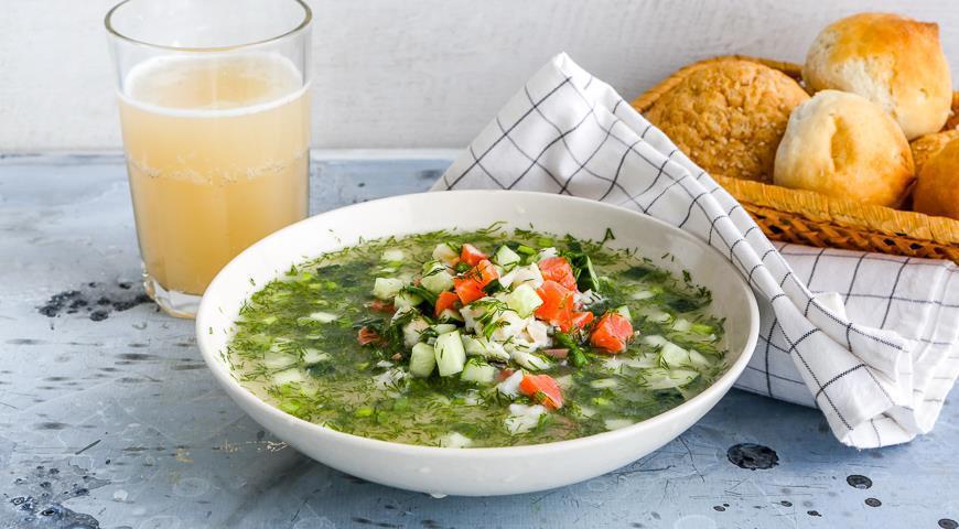 Застывший рыбный бульон разведите квасом и залейте овощную смесь.