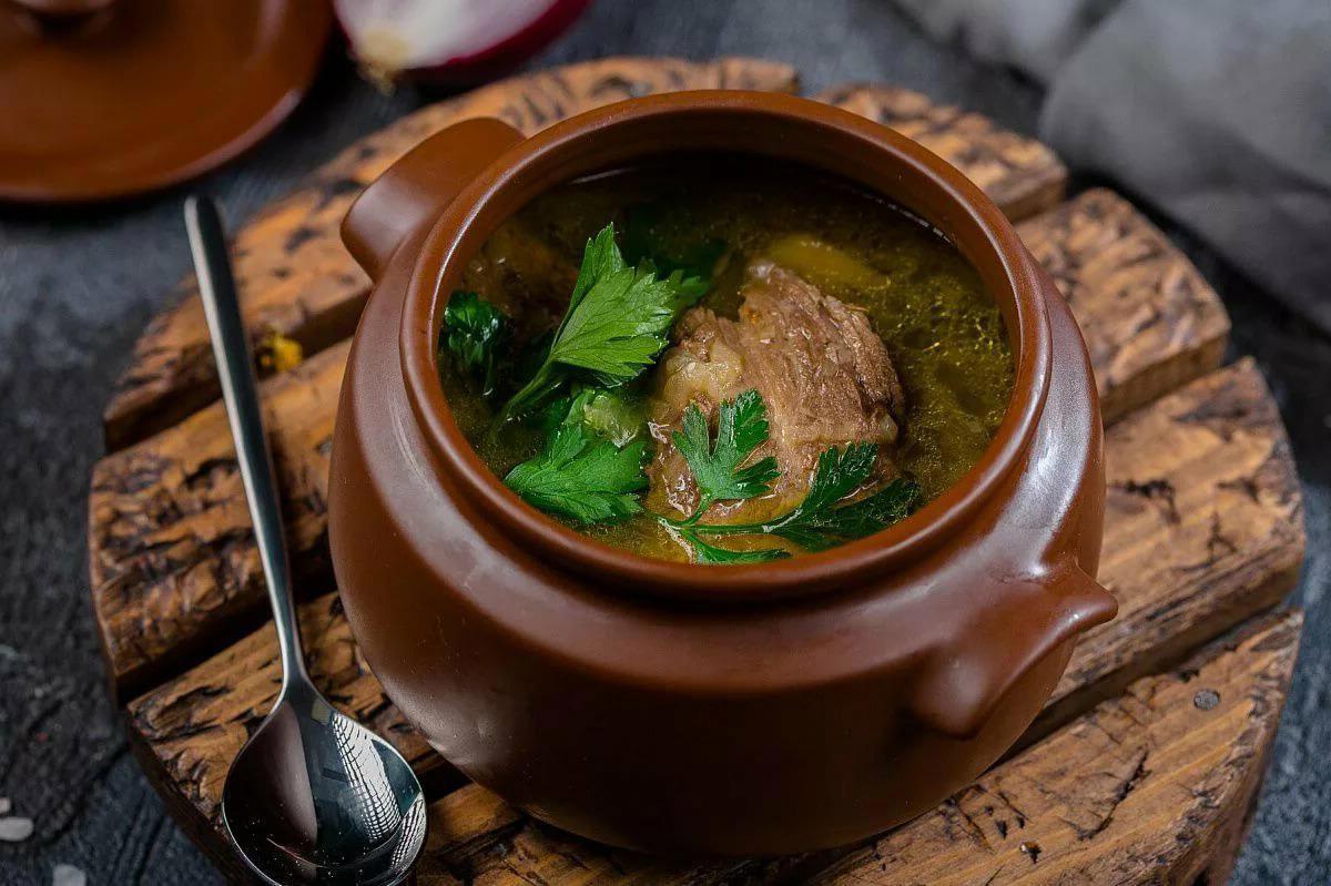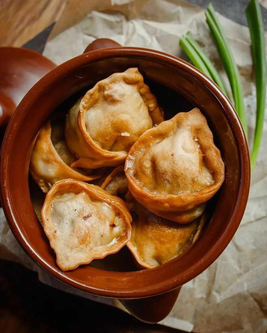 Подрумяненные и подсушенные кундюмы выкладываем в горшочки (или в высокую форму), заливаем бульоном. Снова ставим в духовку минут на 15-20.