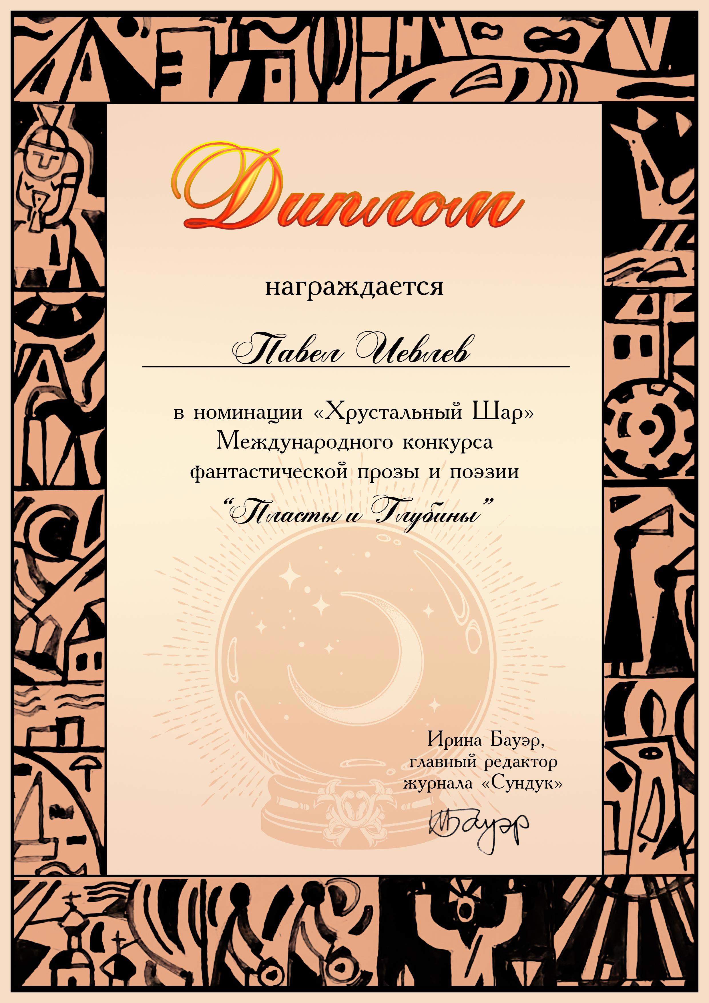 Долго вспоминал, что это и за что, но потом сообразил – за рассказ «Телефон Господень», опубликованный на международном конкурсе фантастики журнала «Сундук». Ценен не сам диплом, а компания, в которой я оказался в номинации «Хрустальный шар»: Лазарчук, Хаецкая…