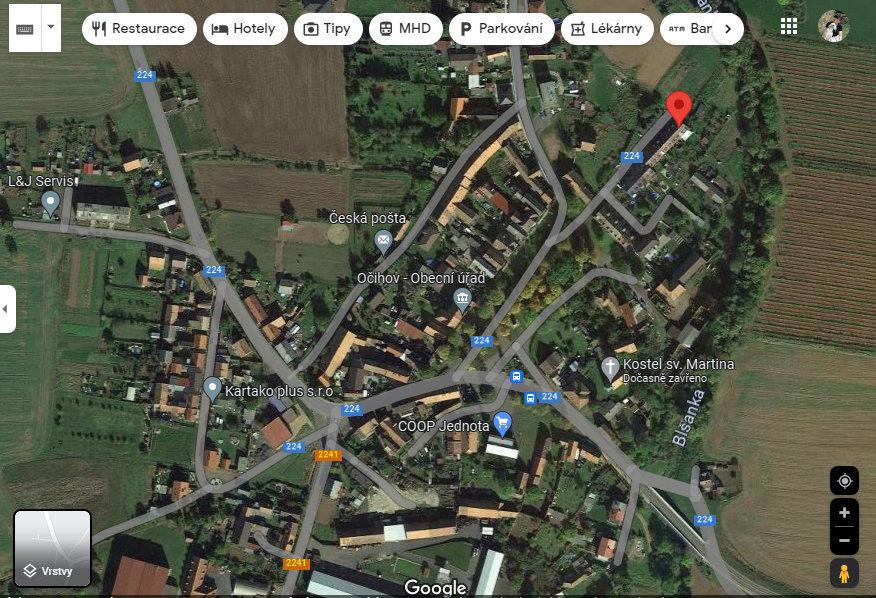Автор: Marika StanovoiДеревня Očihov имеет форму расплющенной медузы вокруг перекрёстка. А мой дом №58 находится в конце одно из тупиковых щупалец (см красная метка на карте у которой виден белый отблеск крыши так наз «зимней заграды» или стеклянной веранды). Далее лужок и под зарослями деревьев — ручей Золотой поток по-немецки или по-чешски речка Блшанка.