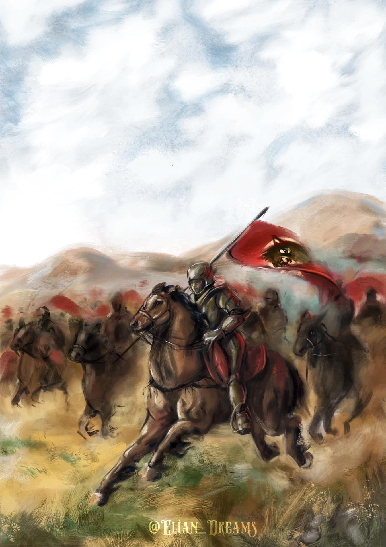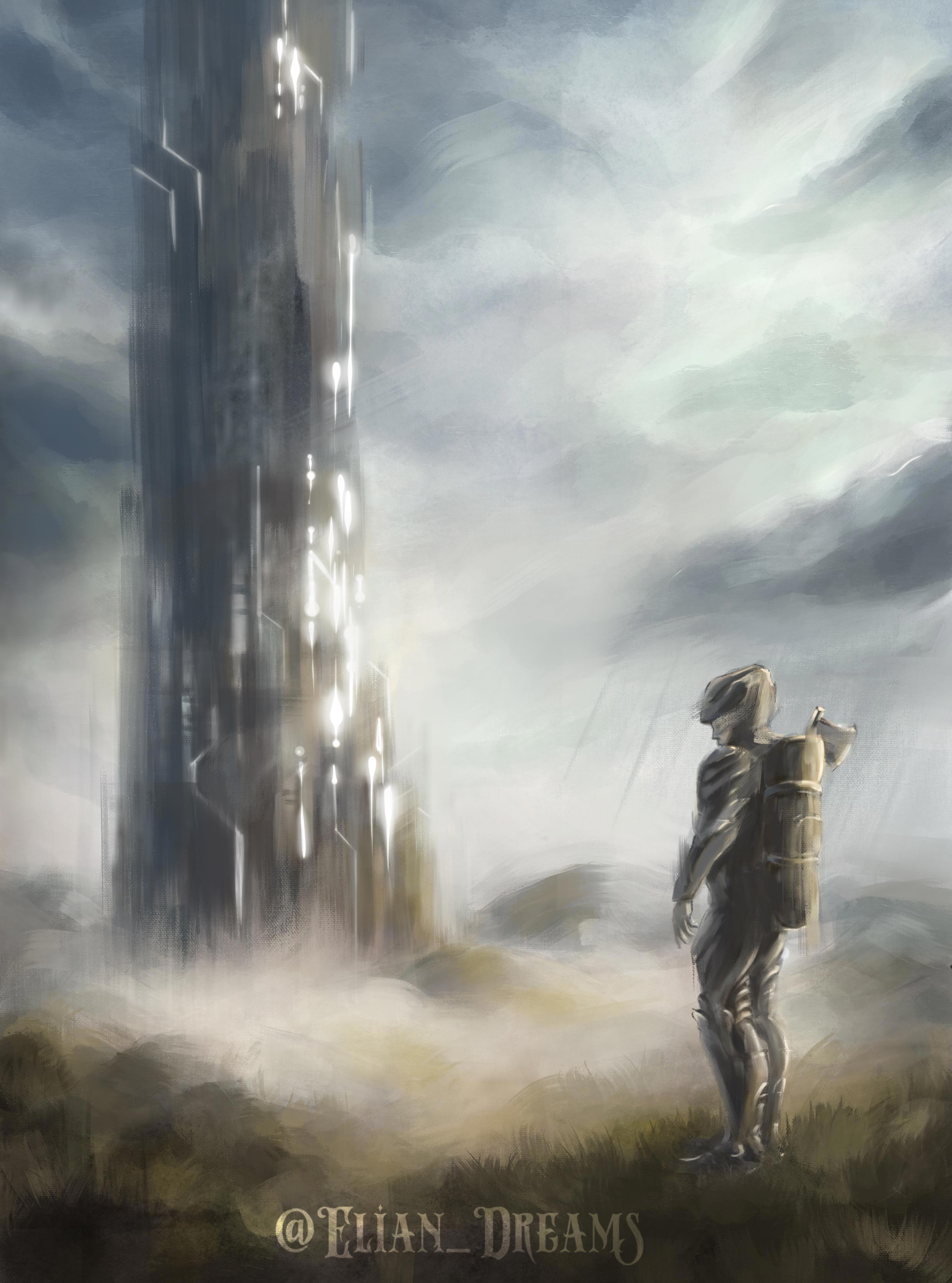 К пятой части рисовка немного поменялась, я продвинулась в освоении диджа , но неизменная часть обложки объединяет все серии, так что необходимости из обложки в обложку использовать те же приемы и кисти нет. Персонаж в доспехе направляется к футуристичной башне вдалеке.