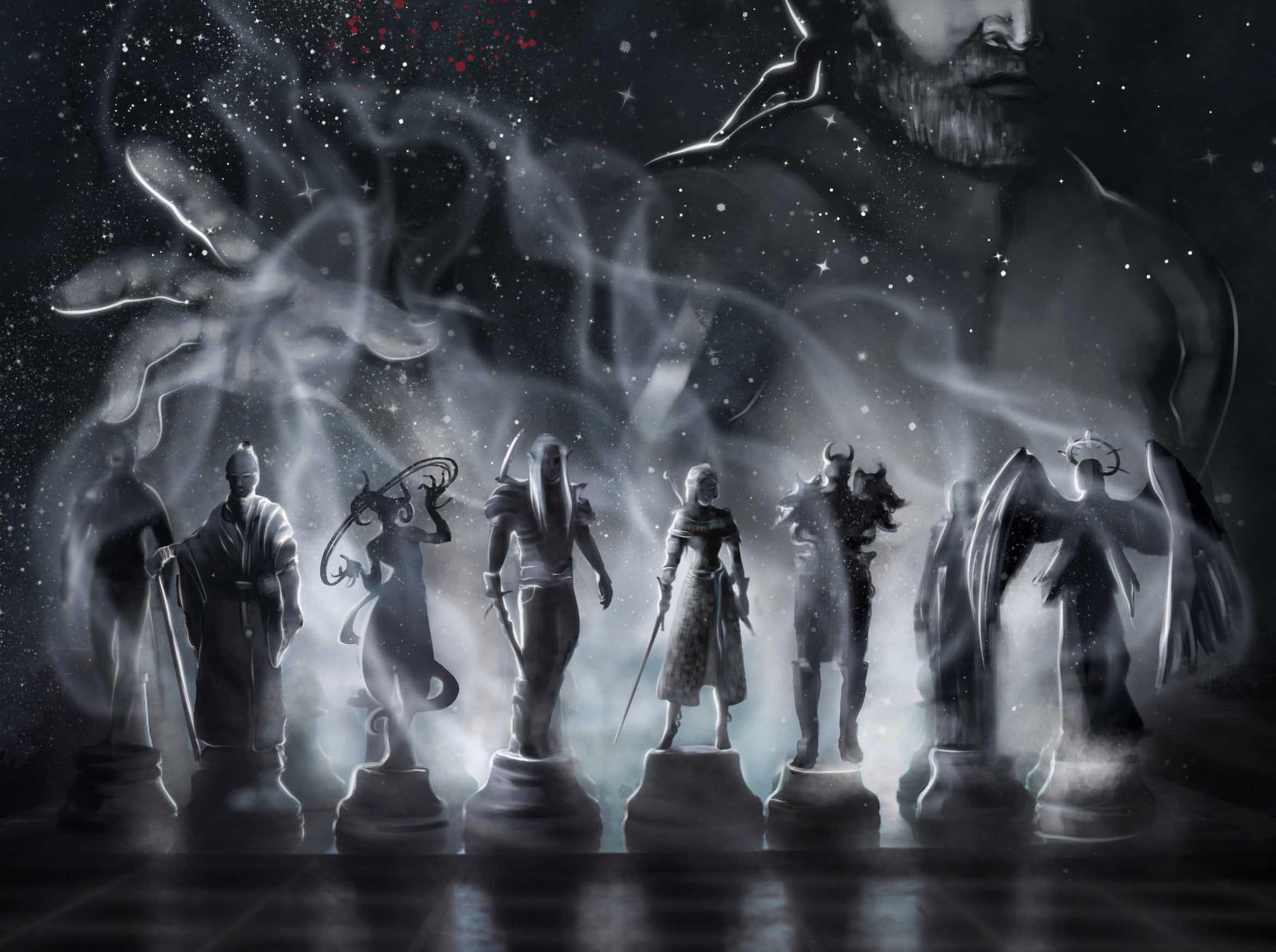 Злобный Бог в образе здорового бугая переставляет фигуры на шахматной доске. Сами же фигуры - разные фэнтезийные жители мира : эльфы, маги, войны и пр.