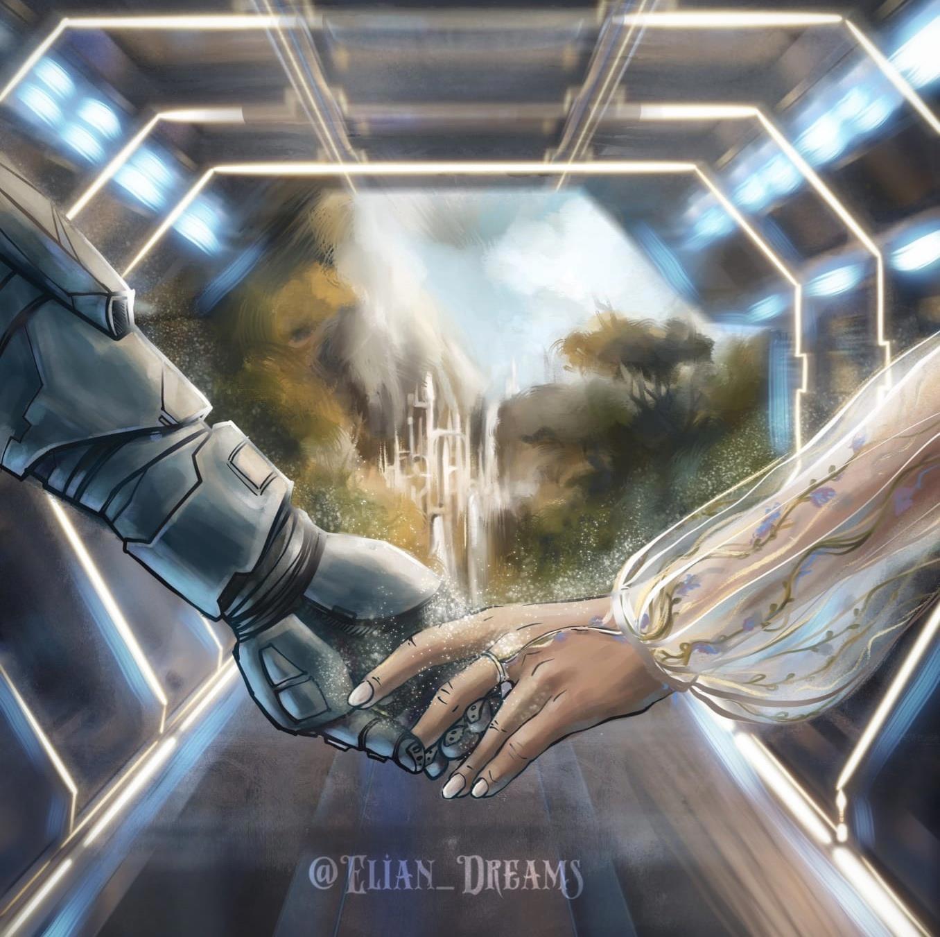 Мужчина в скафандре ведет за руку нежную леди через портал в новый, прекрасный мир.