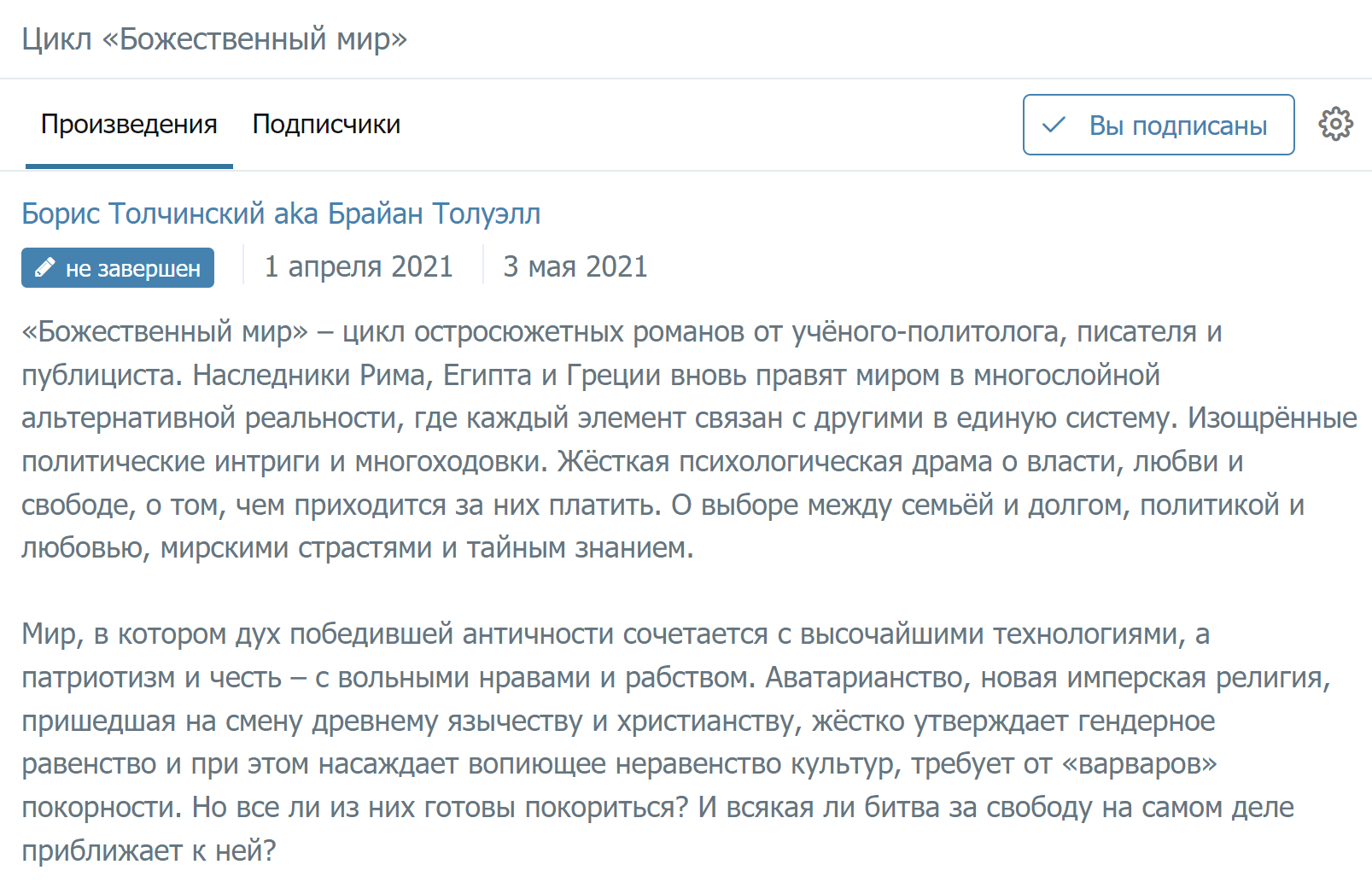 Все продолжения цикла бесплатны и так, а теперь и романы трилогии "Наследники Рима", с которых лучше начинать знакомство с "Божественным миром".