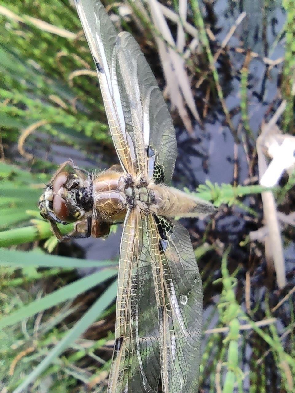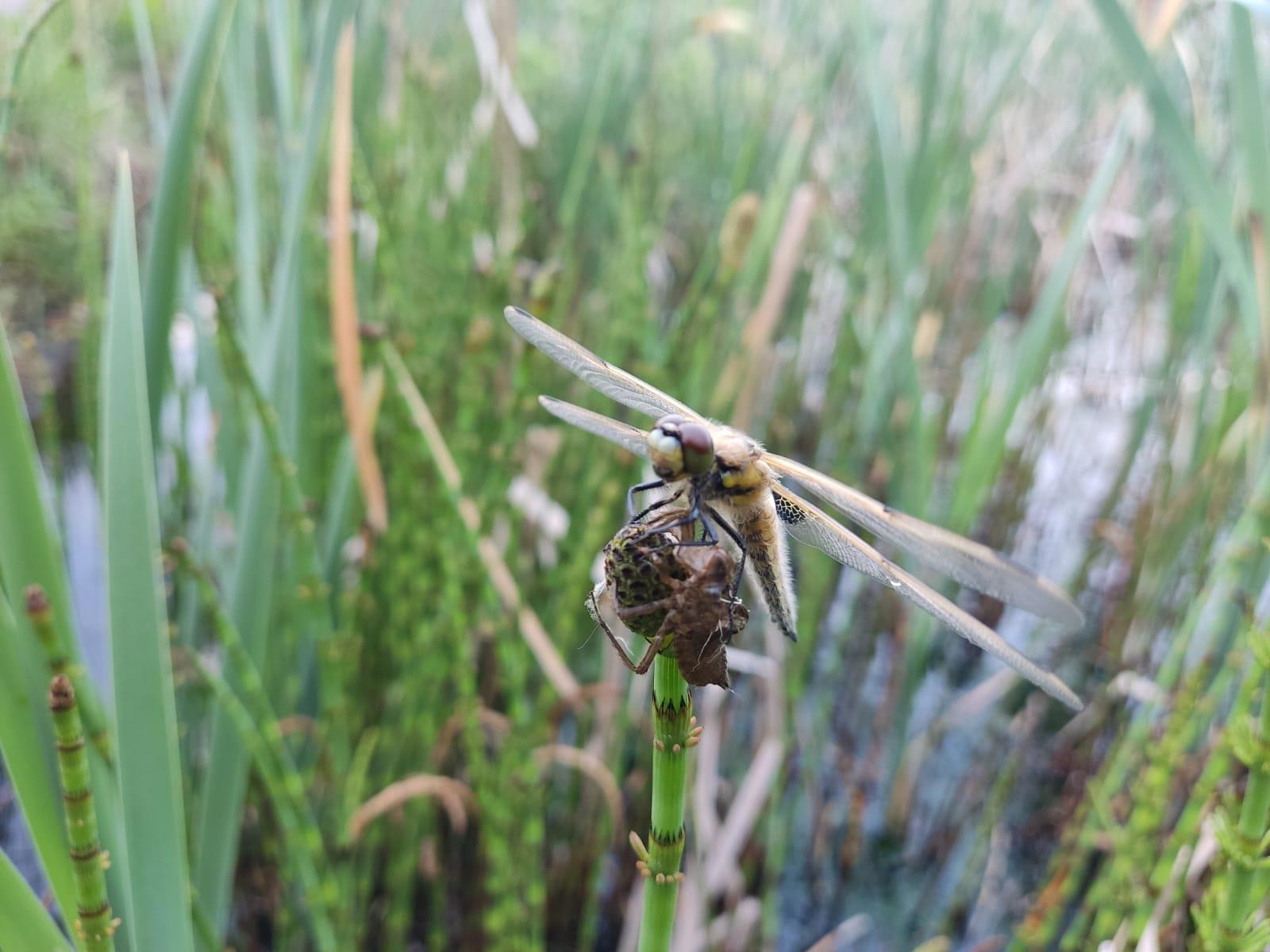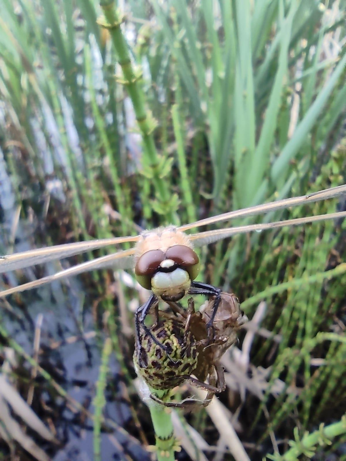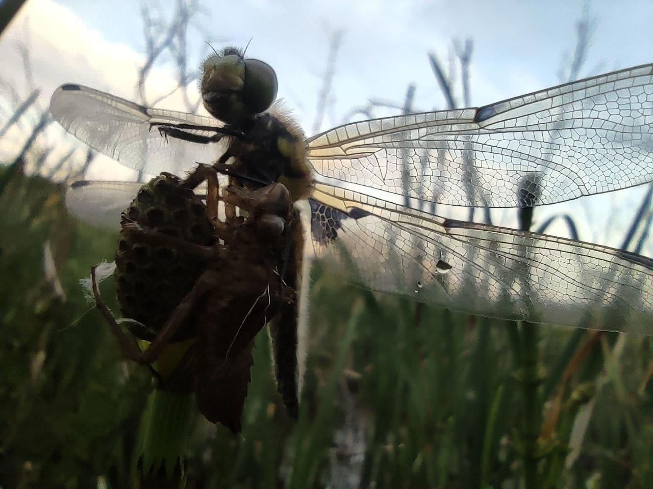 Товарищи, приветствую. Вчера шлялся по окрестностям и увидел свежевылупившуюся стрекозу, ещё шкурка от личинки висела на травинке. Насекомыш после преображения был вообще ни какой и позволил заснять себя во всех ракурсах:)