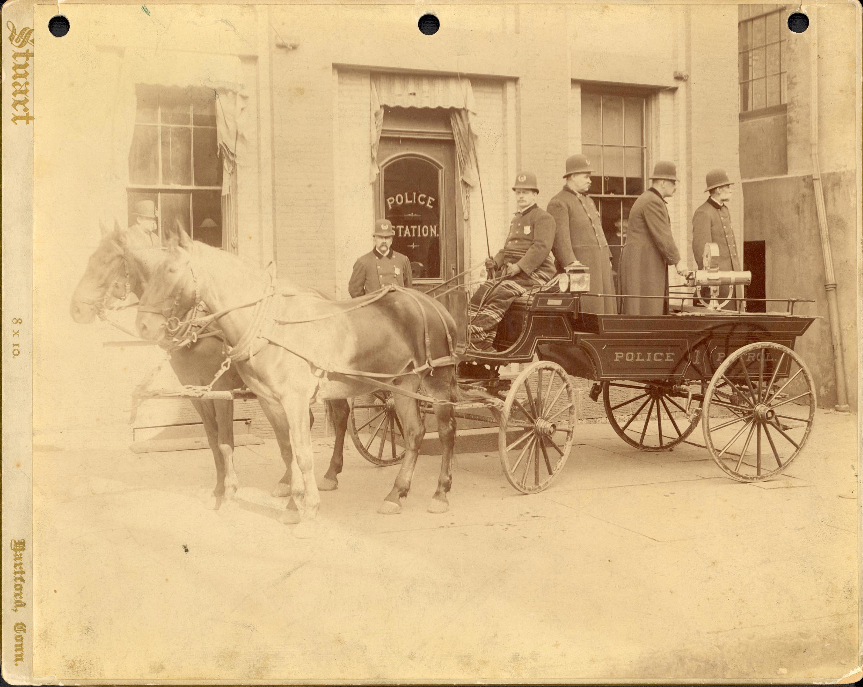 P.S, A horse drawn "Police Patrol" wagon stands in front of a police station in Hartford, Connecticut. Standing in the wagon are four police officers and a Model 1872 "Police" Gatling Gun.