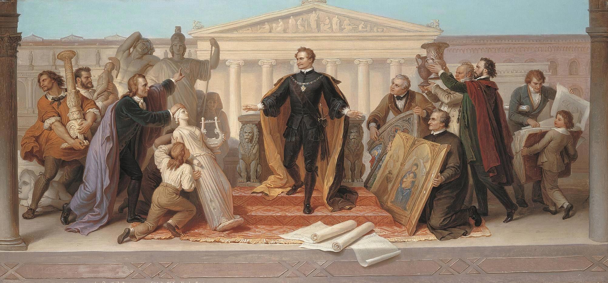 Людвиг I в окружении художников и ученых поднимается с трона, чтобы посмотреть на представленные ему произведения живописи.