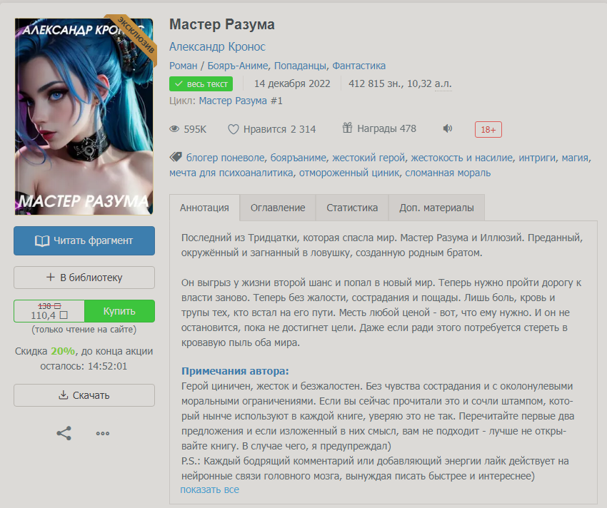 Как и ожидалось, никаким бесцеллером тут и не пахнет. Комменты тоже не радуют. Начало стандартное, интереса не вызывает. Вспоминаю дедушку Фрейда и желание стать великим.