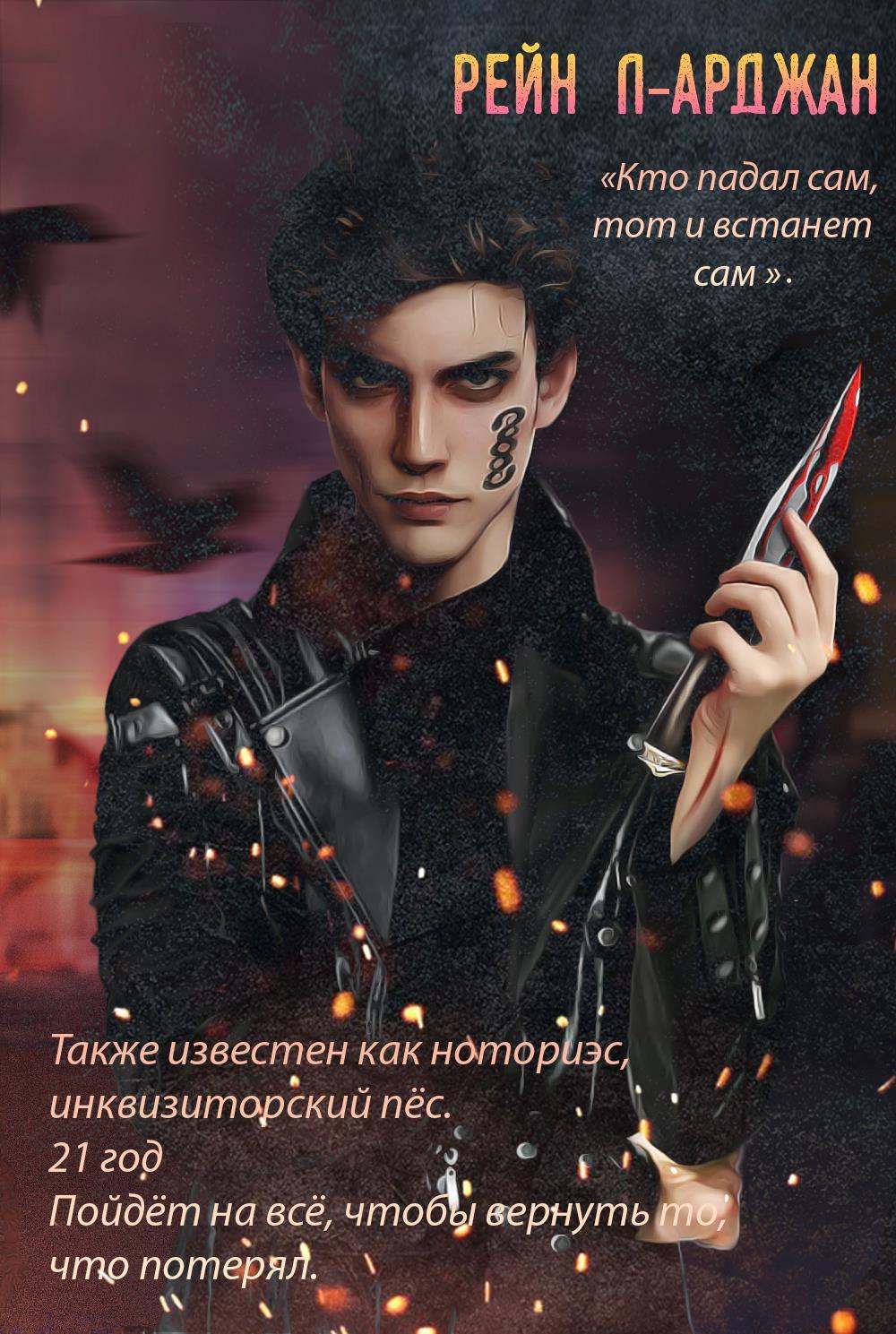 Черные волосы, зачесанные назад, и нос с горбинкой делали его похожим на нахохлившуюся хищную птицу. Одну руку Найдер положил на бухгалтерскую книгу, другой сжимал трость — с каждым словом все сильнее. | Он повернулся правой щекой. На левой от скулы до подбородка тянулся узор из чёрных линий, напоминавших змею — клеймо ноториэса, символ Аша, — и Рейн уже привык прятать его. |