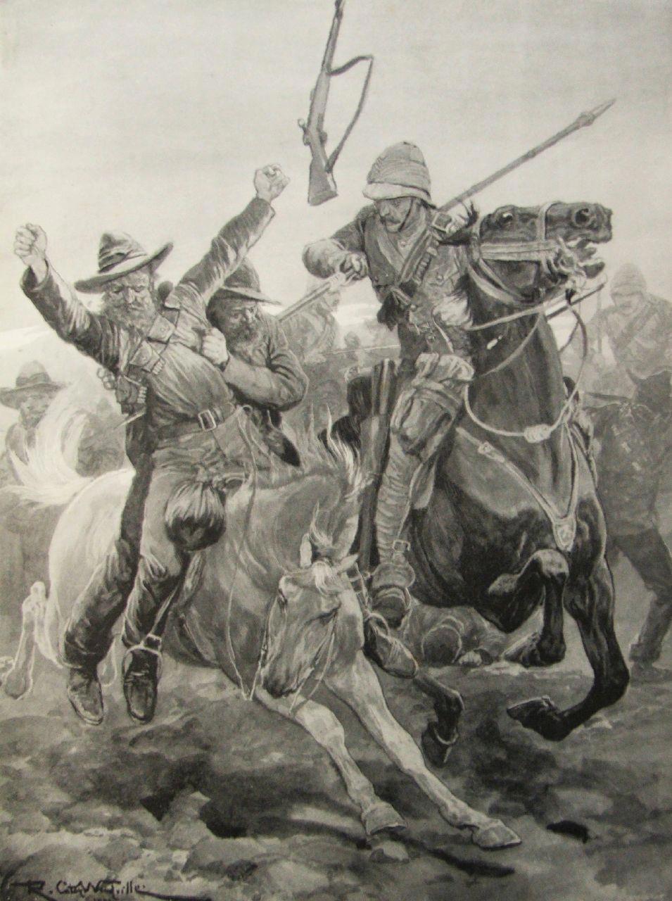 Как некоторые помнят, ход англо-бурской войны (второй. к слову) временами был не очень радостен для англичан. Поэтому их рисовальщикам приходилось вместо сводок с африканского фронта радовать общественность разными духоподъемными картинками. Как один Козьма Крючков Kenny Hooks одним махом убивахом сразу нескольких буров и так далее.