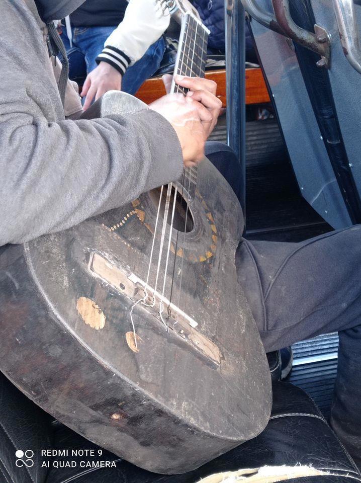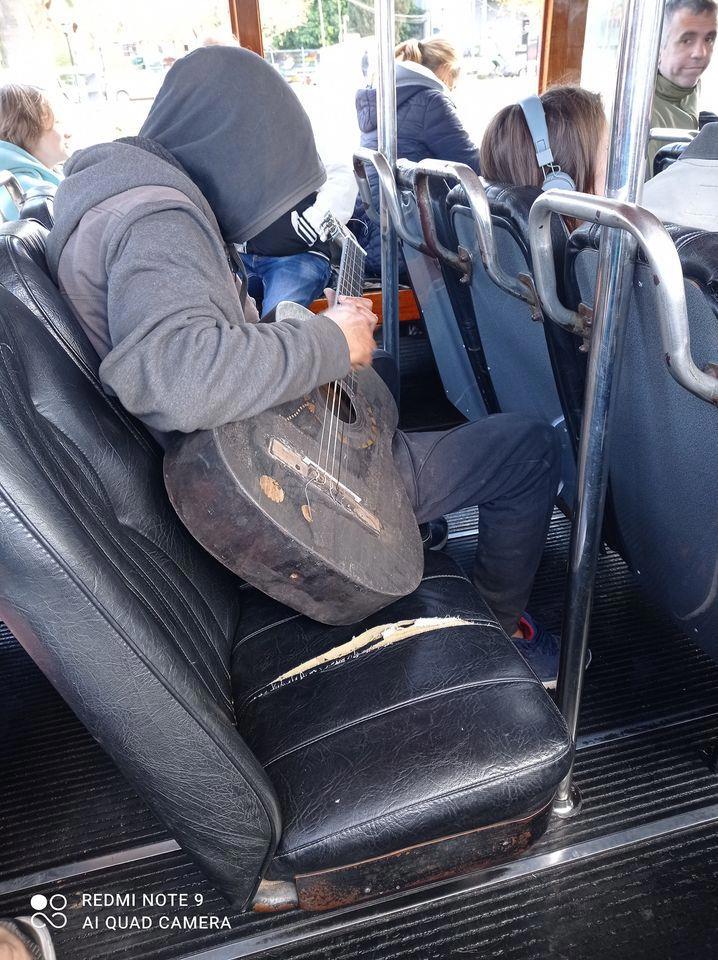 Ну, и вот сидим мы стало быть с сыном у окна, а на средней линии прямо рядом с нами пришел и сел чувак с примечательнейшим дивайсом. То есть сначала ну, смотрю, идет дядька такой, седой почти как я, с гитарой в чехле. Сел, зыркнул - странно, лицо молодое, максимум лет тридцать. Натянул капюшон, снял чехол... Я аж икнула. Пароход зарычал, тронулся, чувак заиграл.