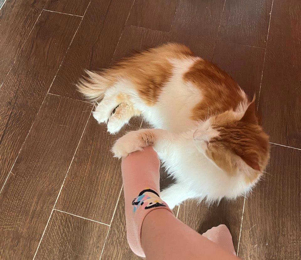 Использует мою ногу как подставку для лапки.