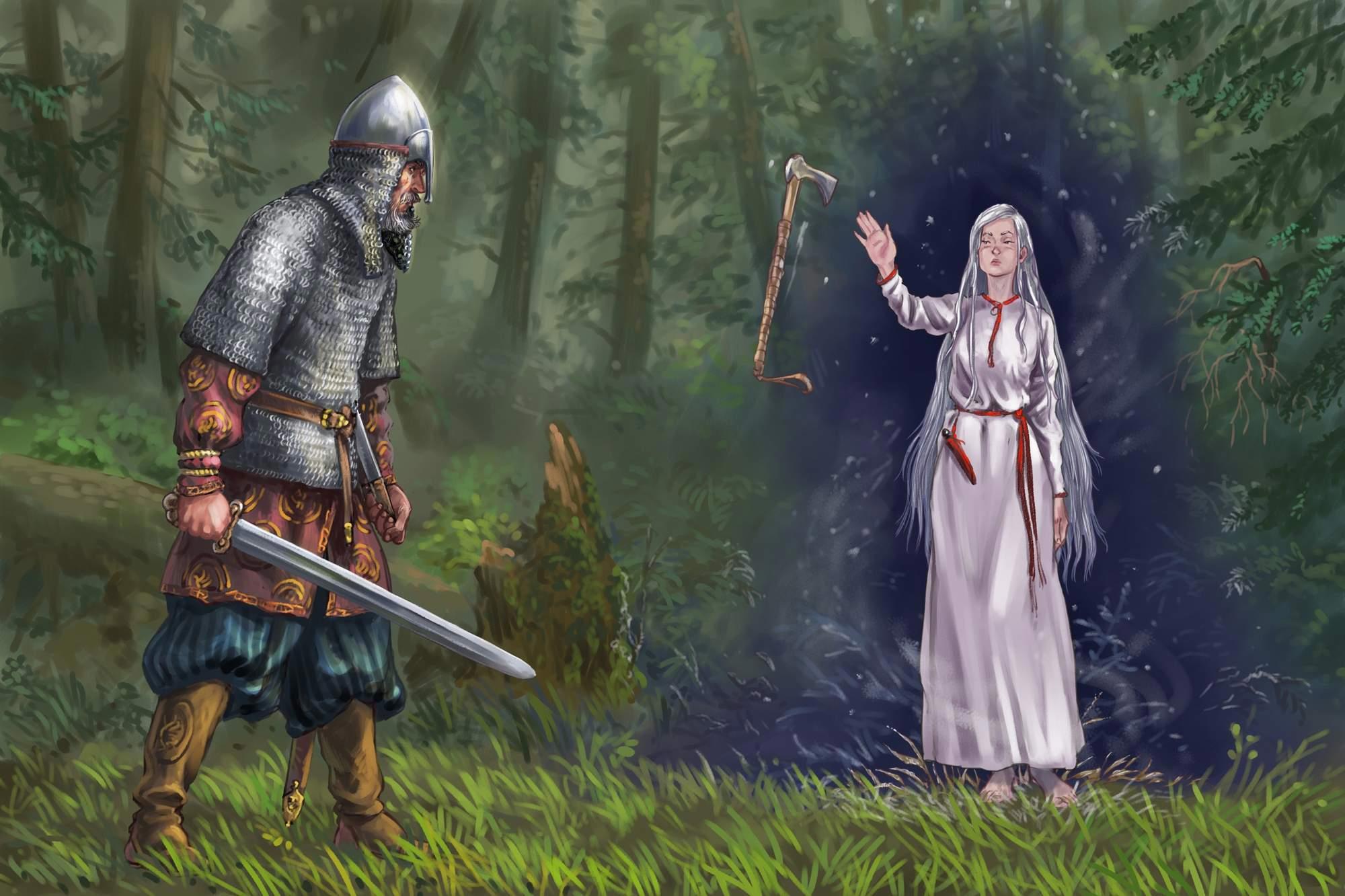 Под утро уже вдруг почуял спиной чужой взгляд. С развороту топорик метнул, меч выхватил, смотрит, а там женщина стоит. Красивая – глаз не отвести. Убор на ней белый, без вышивки, на поясе ножик маленький с черным камнем в оголовье. И его топорик меж ними над землей висит – недалеко пролетел.