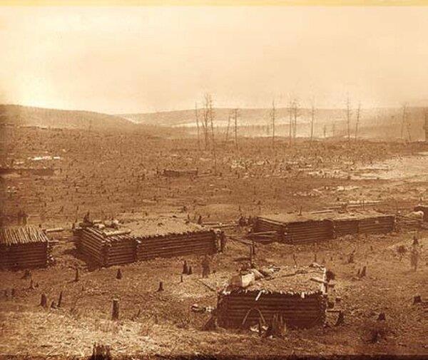 Вырубленный на постройки лес и дома поселенцев не Желтуге