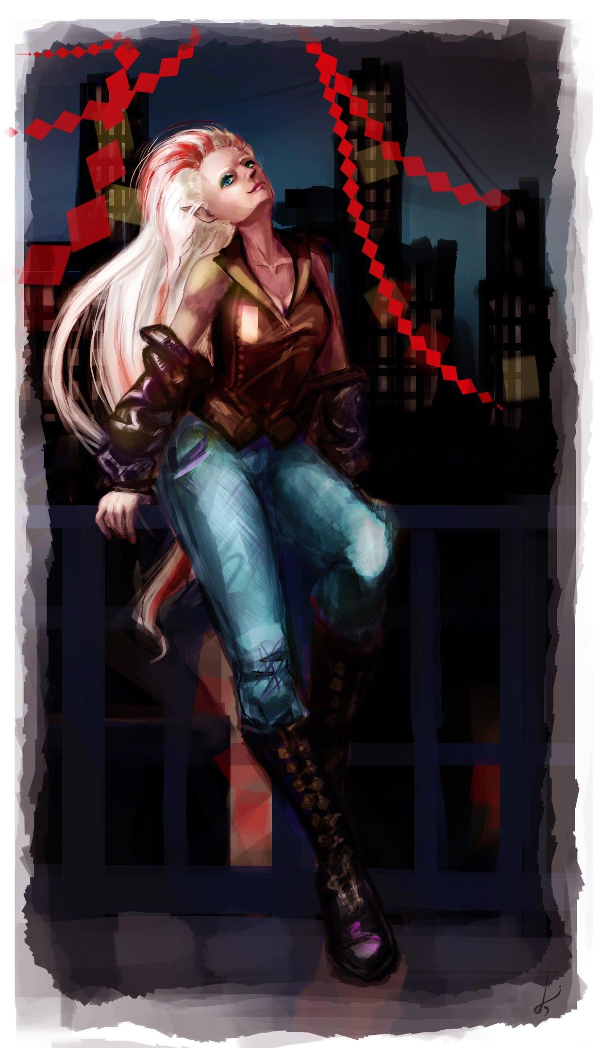 От матери - эльфы ее отличают менее заостренные ушки, смуглая кожа и, разноцветные глаза. Пожалуй, самое запоминающееся - это как раз глаза, один небесно-голубого цвета, а другой цвета молодой зелени. Прямой нос с чуть вздернутым кончиком. Слегка пухловатые губы. И заостренные клыки, заметно удлиняющиеся в гневе. Волосы девушки пышные и густые, за ними определенно ведется тщательный уход. По необъяснимой причине меняют с белоснежного цвета на алый оттенок. Не редко эти цвета совмещаются, образуя своеобразное мелирование, что смотрится весьма интересно, ведь волосы подстрижены прядками на разную длину.