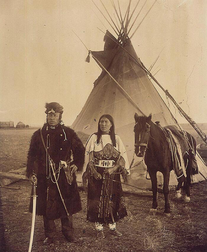 "Индийский разведчик Северо-Западной конной полиции "Собачий ребенок" и его скво (черноногие индейцы), Глейхен, Северо-Западный Запад ". 1894 год, автор Норман Кейпл.Главный герой этого фото — черноногий разведчик из отряда Северо-Западной конной полиции в южной части Альберты по имени Дог Чайлд, также известный как Виннипег Джек. Пёс Чайлд был известен тем, что выслеживал конокрадов, торговавших скотом по всей территории США."